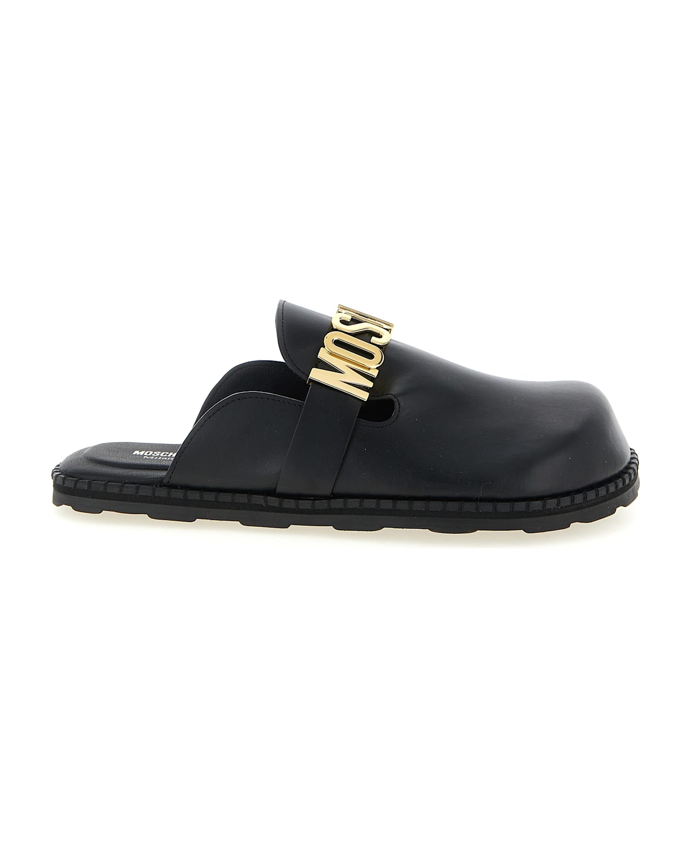 Leather sabots, strap with metal lettering logo, micro midsole, TPU sole with polka dot effect. Composition: 100% calfskin leather (Bos Taurus)