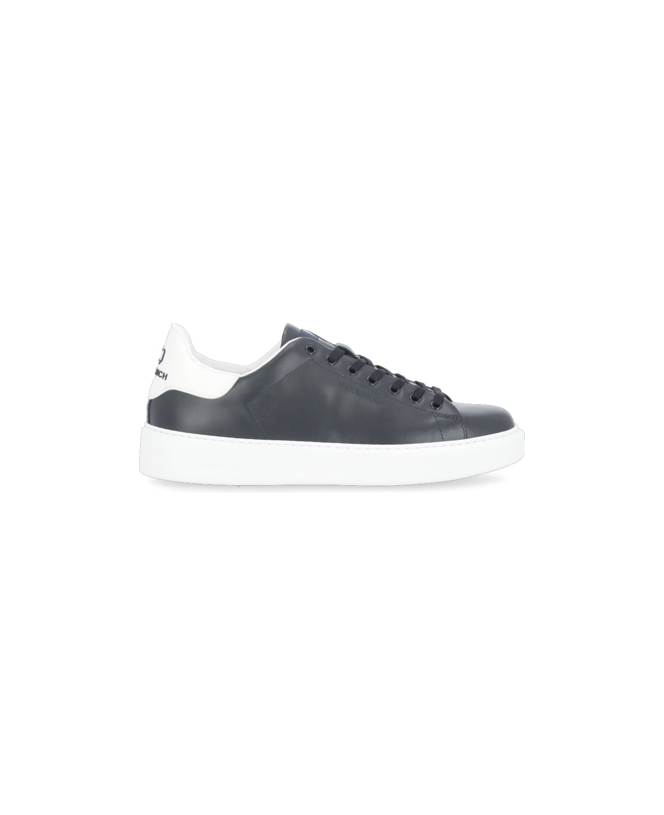 Leather Sneakers from Woolrich: - Blue navy Woolrich smooth leather sneakers for man - Round toe - Front tone on tone laces fastening - Tone on tone Woolrich tab at tongue - Side embossed Woolrich logo - Upper heel contrasting color Woolrich relief thermoapplication - Raised rubber sole (3 cm)