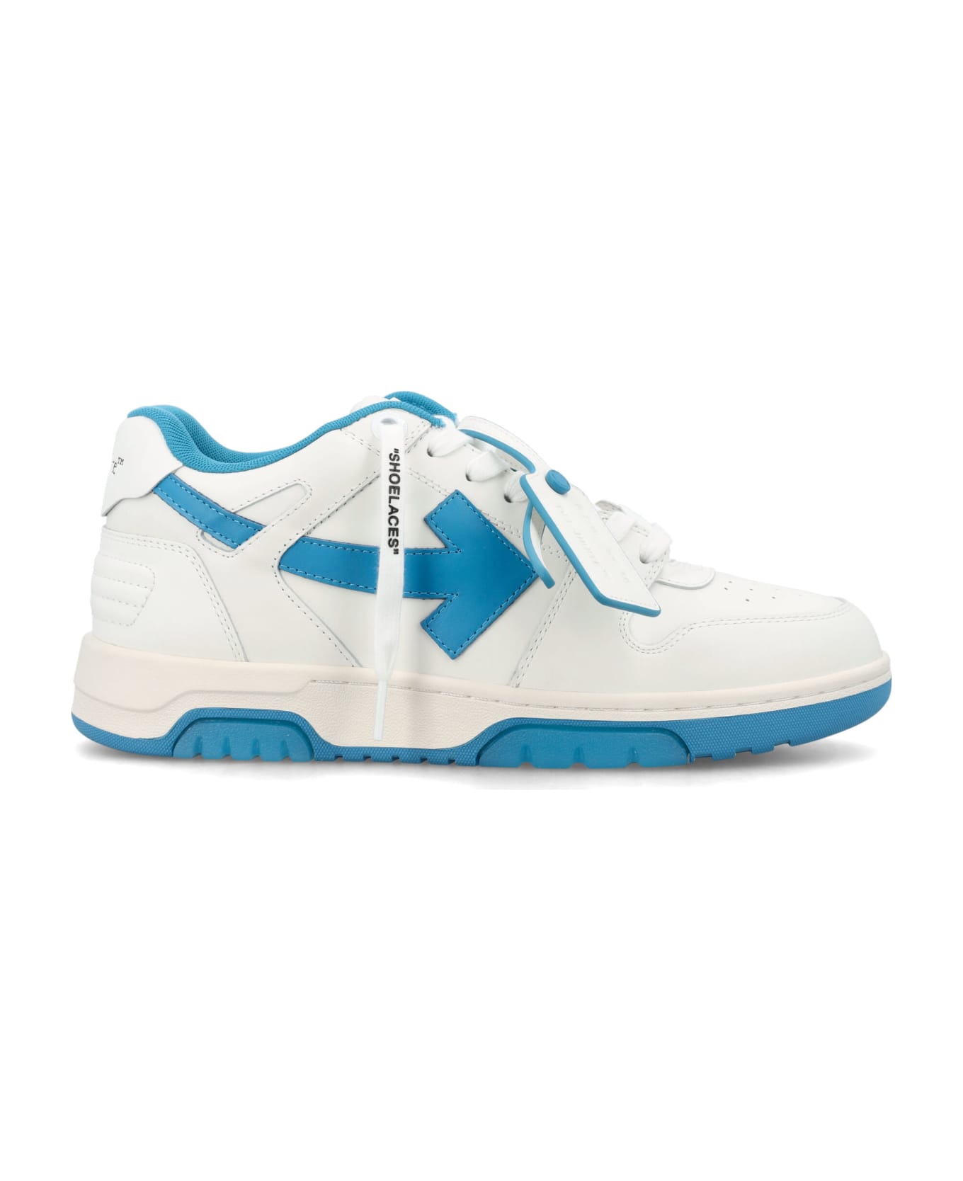 Out Of Office Calf Leather Sneakers By Off-white. Featuring: Low-top Round Toe Lace-up Fastening Perforated Details Contrast Arrow On The Side Off-white Logo On The Back Contrasting Outsole With Translucent Gel Insets