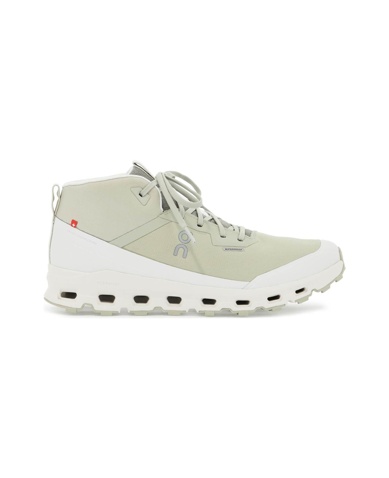 The On Cloudroam Waterproof sneakers are made with 100% recycled technical material and feature a waterproof membrane. They have a front lacing system, logo on the back and side, and a lined interior with a removable insole. The midsole is made of Helionâ ¢ supersoft foam and the outsole has Missiongripâ ¢ technology for superior traction.
