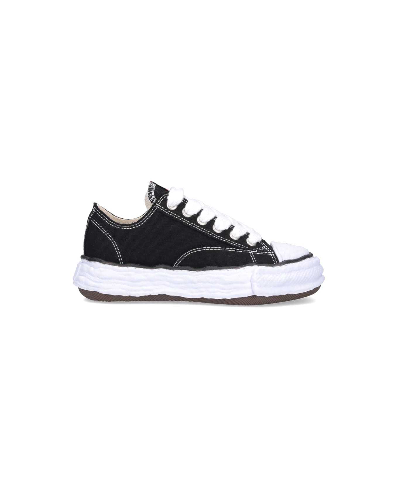 Maison Mihara Yasuhiro Peterson23 OG low-top sneakers, in black cotton, contrasting stitching, round toe, lace-up closure, logo tab on label, textured rubber sole, embossed logo patch detail on back.