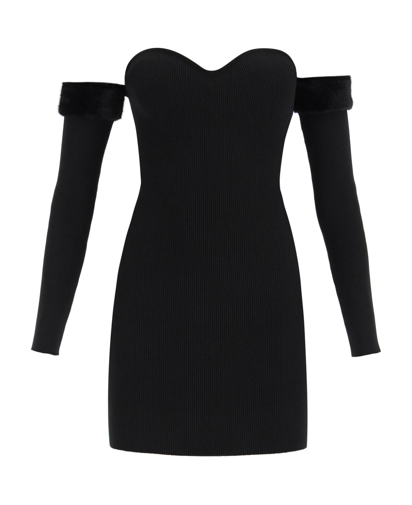Staud mini dress in ribbed viscose blend knit, featuring an off-shoulder design with sweetheart neckline and long sleeves finished with a faux fur upper edge. Fitted silhouette, back invisible zip closure. The model is 177 cm tall and wears a size XS.