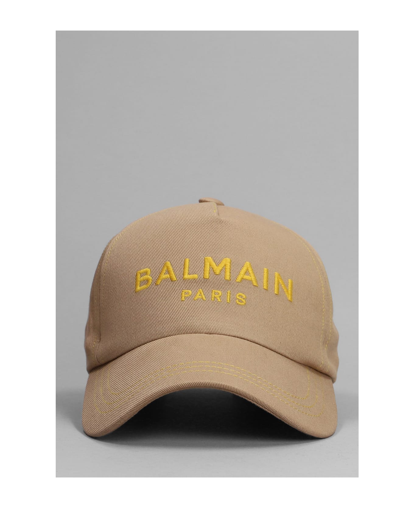 Hats in taupe cotton, curved peak, front logo, adjustable belt, 80% polyester, 20% cotton, Made in Bulgaria