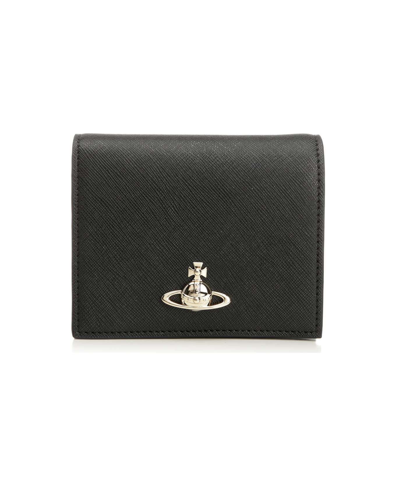 Vivienne Westwood foldover wallet with card and coin compartments, snap button fastening and metallic Orb applique