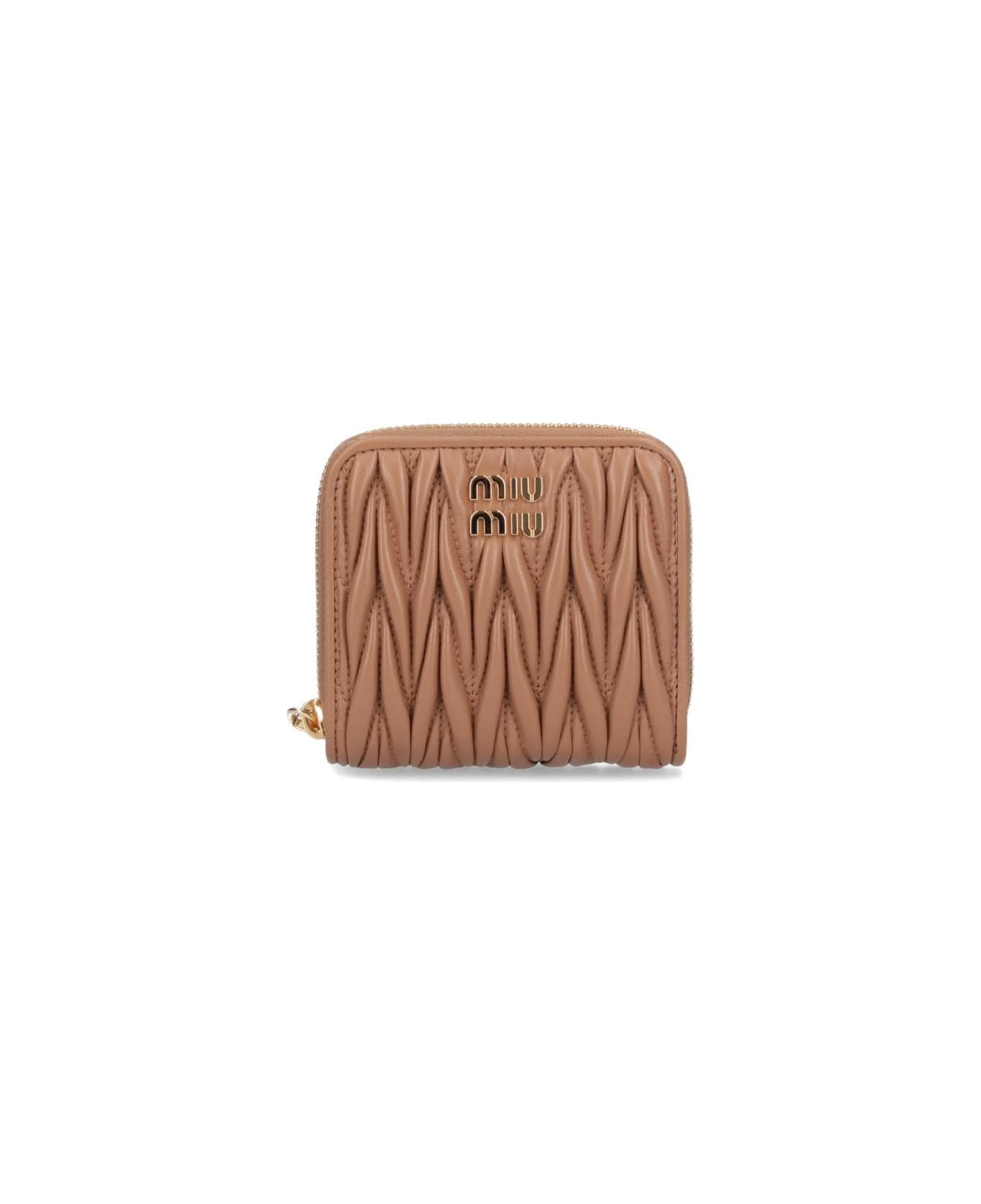 Miu Miu logo wallet in caramel matelassé nappa leather with quilted effect, gold metal logo on the front, zip and snap button closure, eight inner card slots, and an inner bill compartment. composition: 100% lambskinsize and fit: h 11 x w 10 x d 3 cm