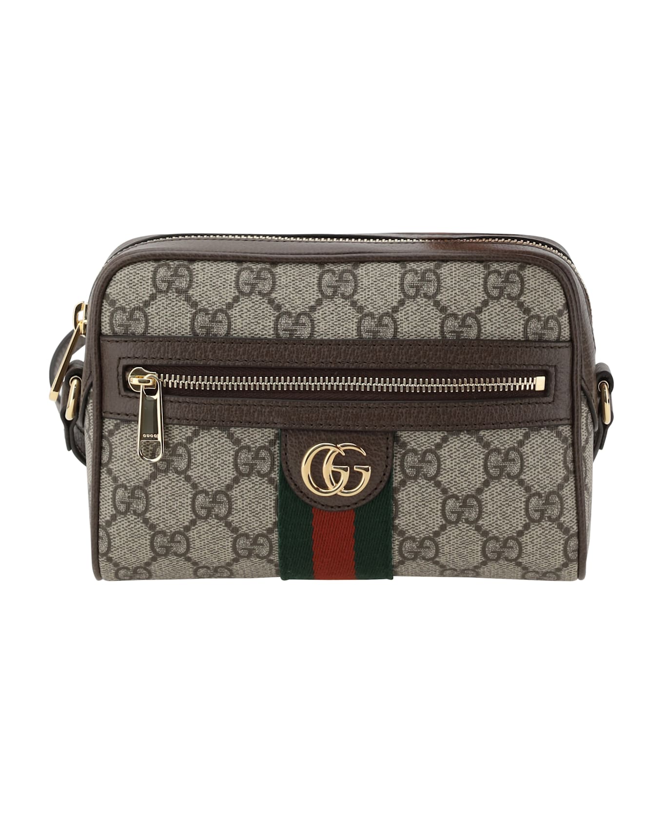 The gucci ophidia mini shoulder bag is an elegant and versatile accessory, crafted from gg supreme canvas with high-quality leather trim. the adjustable shoulder strap allows it to be easily adjusted to different lengths, while the top zip closure ensures practicality and security. a front zipped slip pocket offers extra space for small items, while keeping the interior organized. the iconic gg metal plaque applied on the front adds a distinctive and luxurious touch, while the webbing detail with colored bands, applied on the front and back, gives a vibrant and recognizable accent, typical of gucci's signature style.