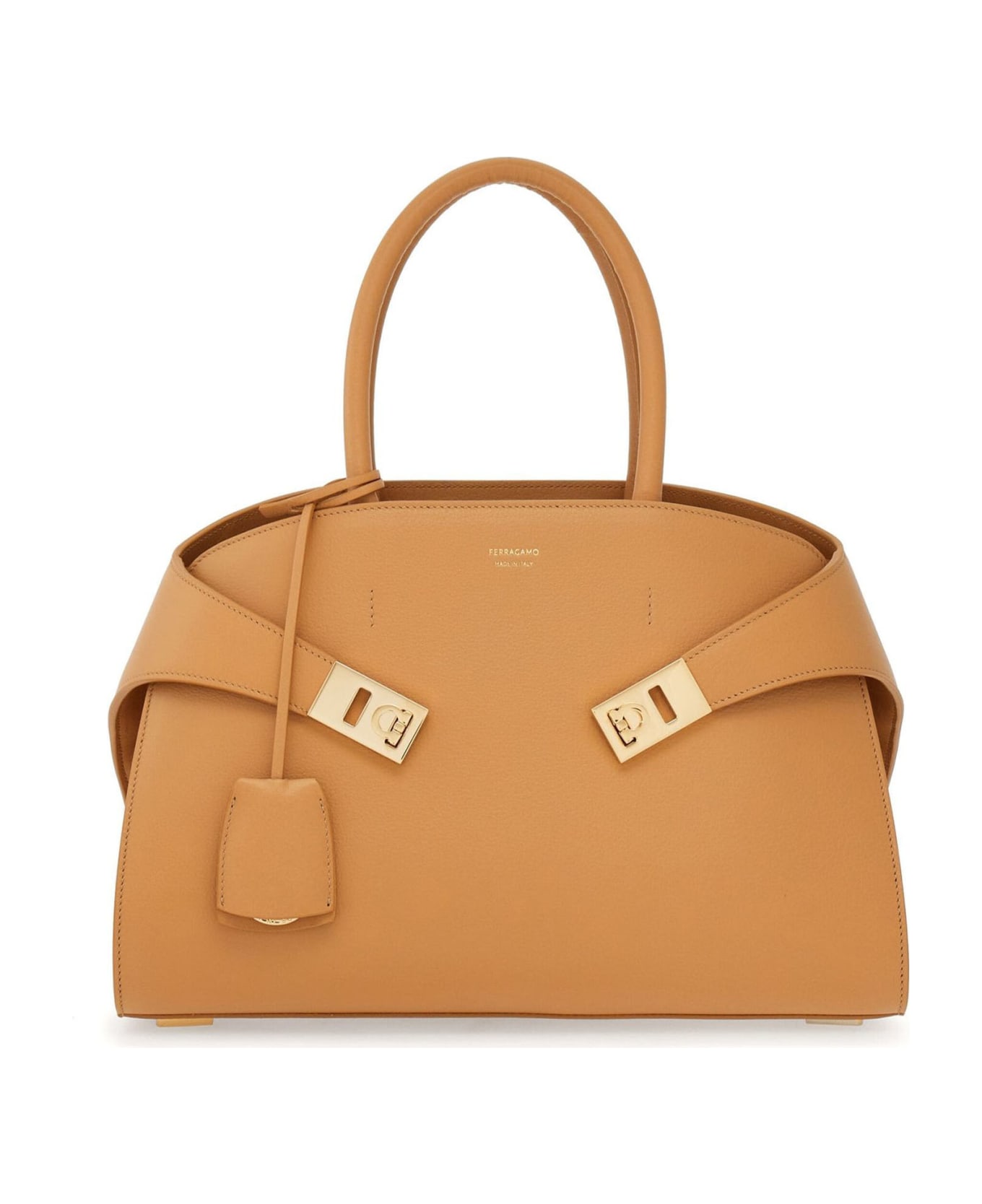 Light camel Hug handbag (S), natural-grain calfskin, construction with asymmetrical back that wraps the accordion sides and fastens with the golden-finish Gancini buckles, fastens on the inside with a ring and is complemented by the keyring charm and zipped lined pocket. The branded rectangular feet studs ensure protection for the base. Shoulder strap length: 55 cm, height 22. 0 CM / 8. 6 IN, length 31. 5 CM / 12. 4 IN, width 19. 0 CM / 7. 4 IN