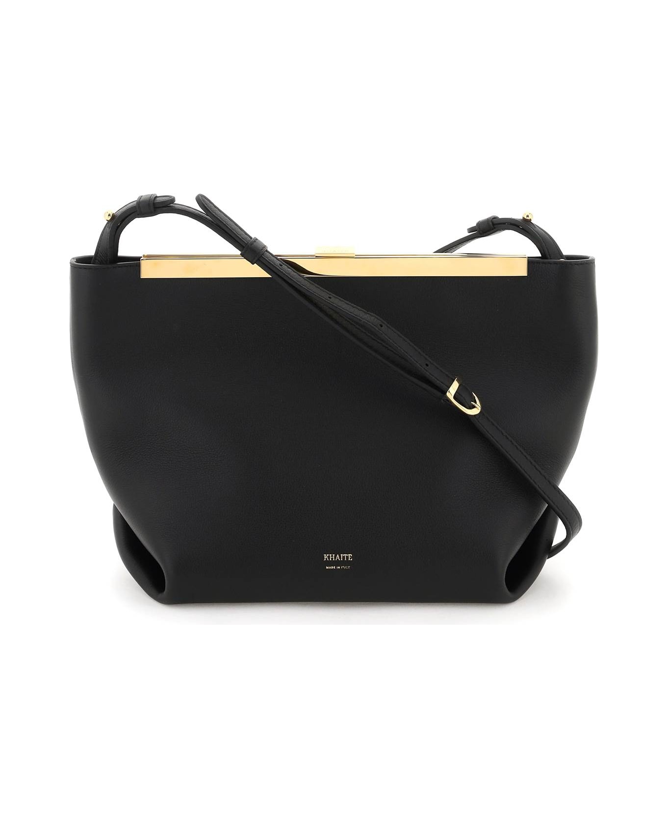 Agnes grained leather bag by Khaite, characterized by a slightly structured line with a hinged frame, and a snap closure with engraved logo in golden metal. Removable and adjustable shoulder strap, gold-tone logo print on the front, grosgrain-lined interior with three leather pockets for credit cards.