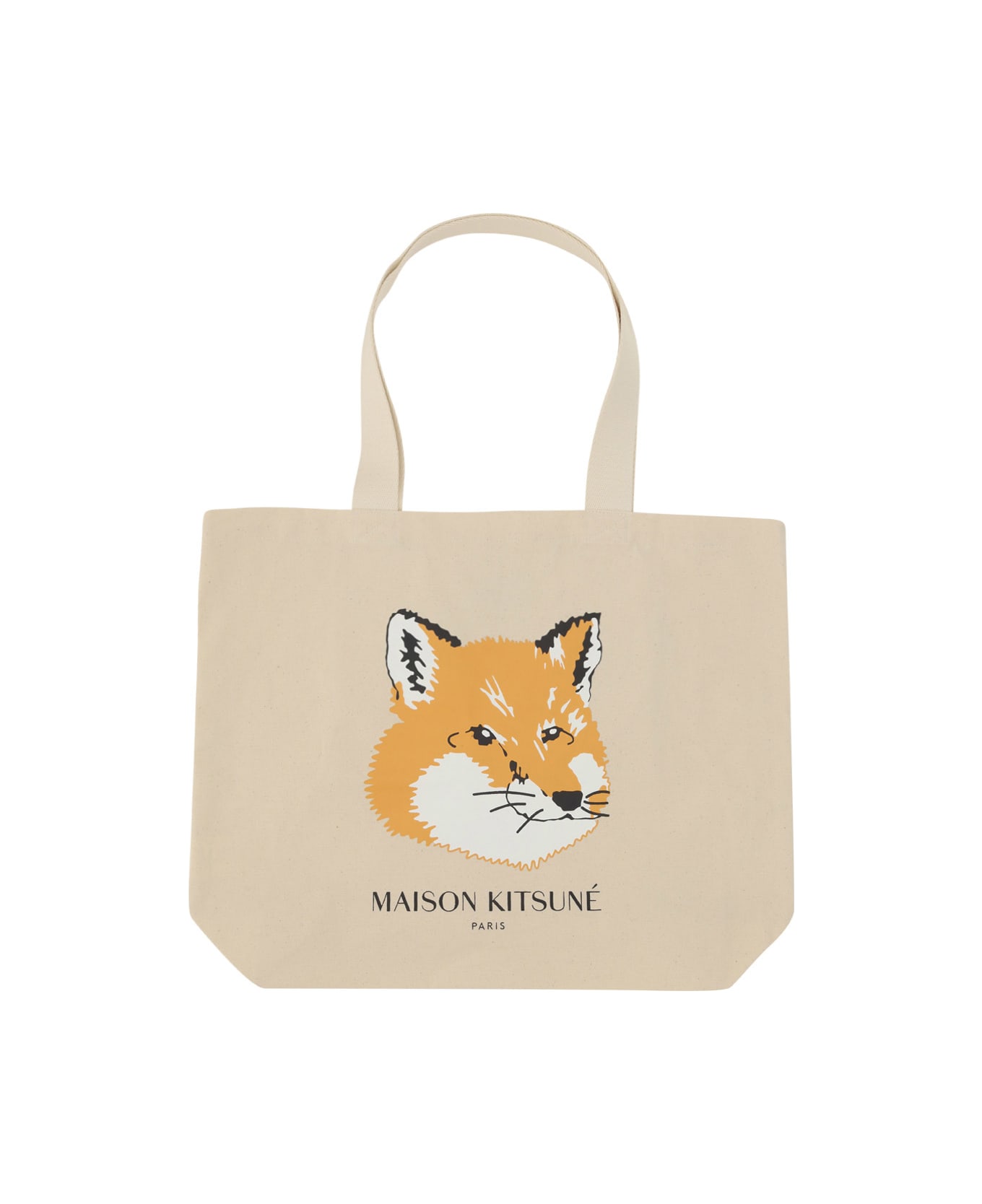 Cotton fox head tote bag by maison kitsuné, iconic contrasting brand logo and monogram on front, two flat top handles, single interior compartment.