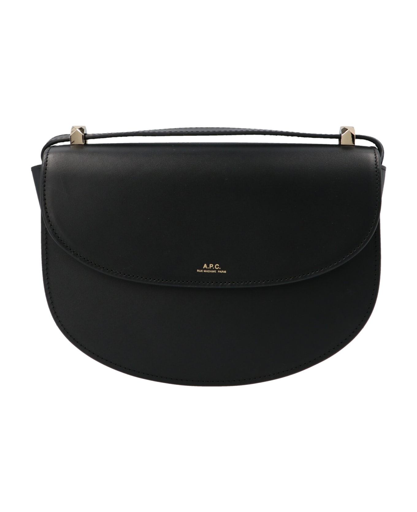 Geneve' black leather crossbody bag with flap, gold logo print and awith adjustable shoulder strap.