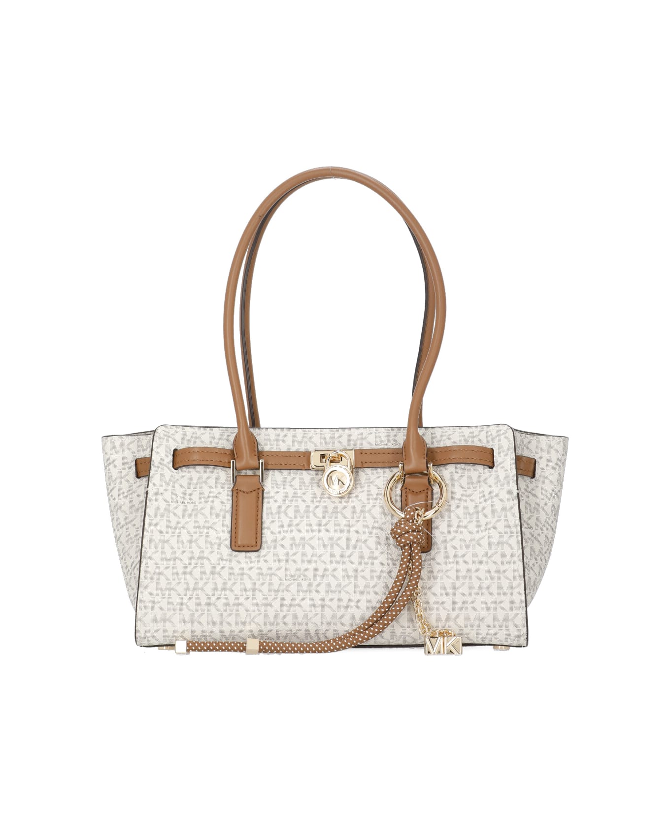 - Ivory Michael Kors shoulder bag for woman - Two contrasting colour adjustable leather handles - One main compartment with zip fastening - All-over monogram - Two internal welt pocket - Front metallic details