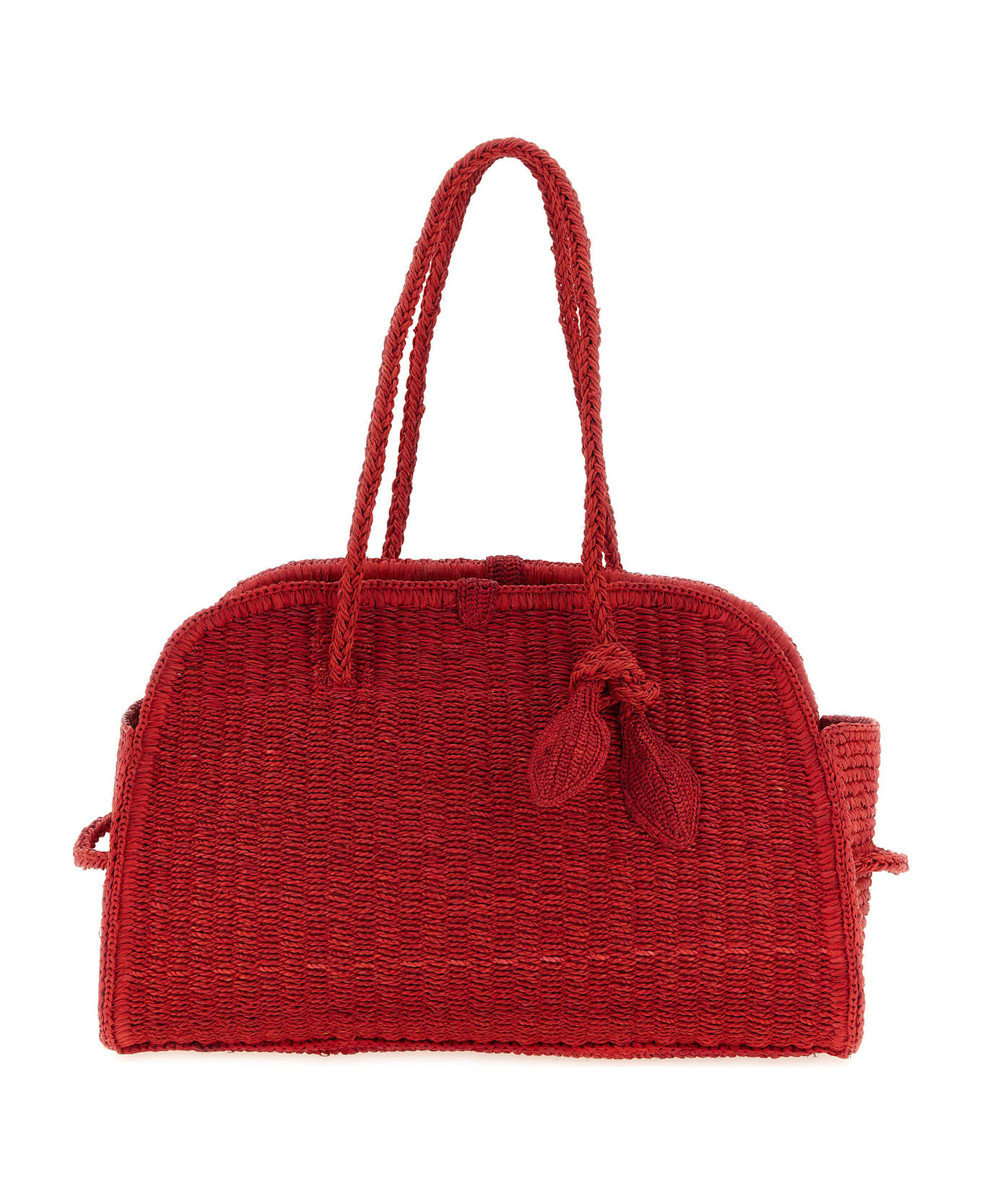 'Le Turismo Raphia' shoulder bag in woven raffia basket, bowling model, double fixed handle with front bow detail, inner leather pocket. Product handmade by artisans in Madagascar, any imperfections are to be considered characteristics of uniqueness.