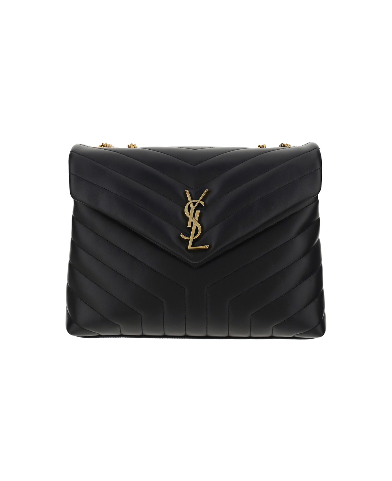 Calfskin loulou shoulder bag by saint laurent, medium size, quilted leather all over, magnetic flap closure with brass logo on front, double shoulder chain with leather details. three interior compartments with zip closure in the middle, one zip pockets and golden embossed logo on leather label.