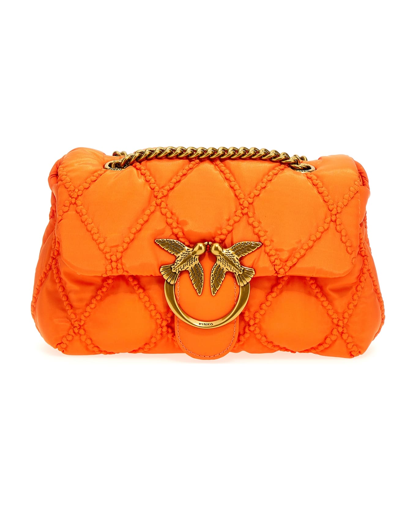Love' quilted crossbody bag with front metal logo appliqué, a flap closure, a chain shoulder strap.