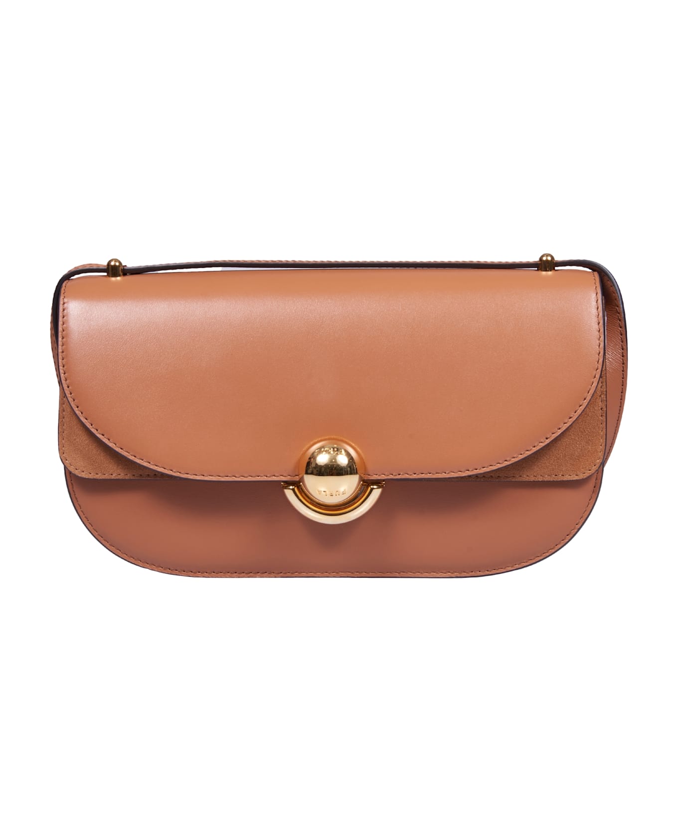 Brandy color Sfera bag. Flap closure and gold colored sphere. Removable and adjustable shoulder strap. Tone-on-tone suede inserts. Inside 1 patch pocket 1 zipped pocket. Dimensions: 16 x 26 x 8 cm. Composition: 100% leather. Made in China.