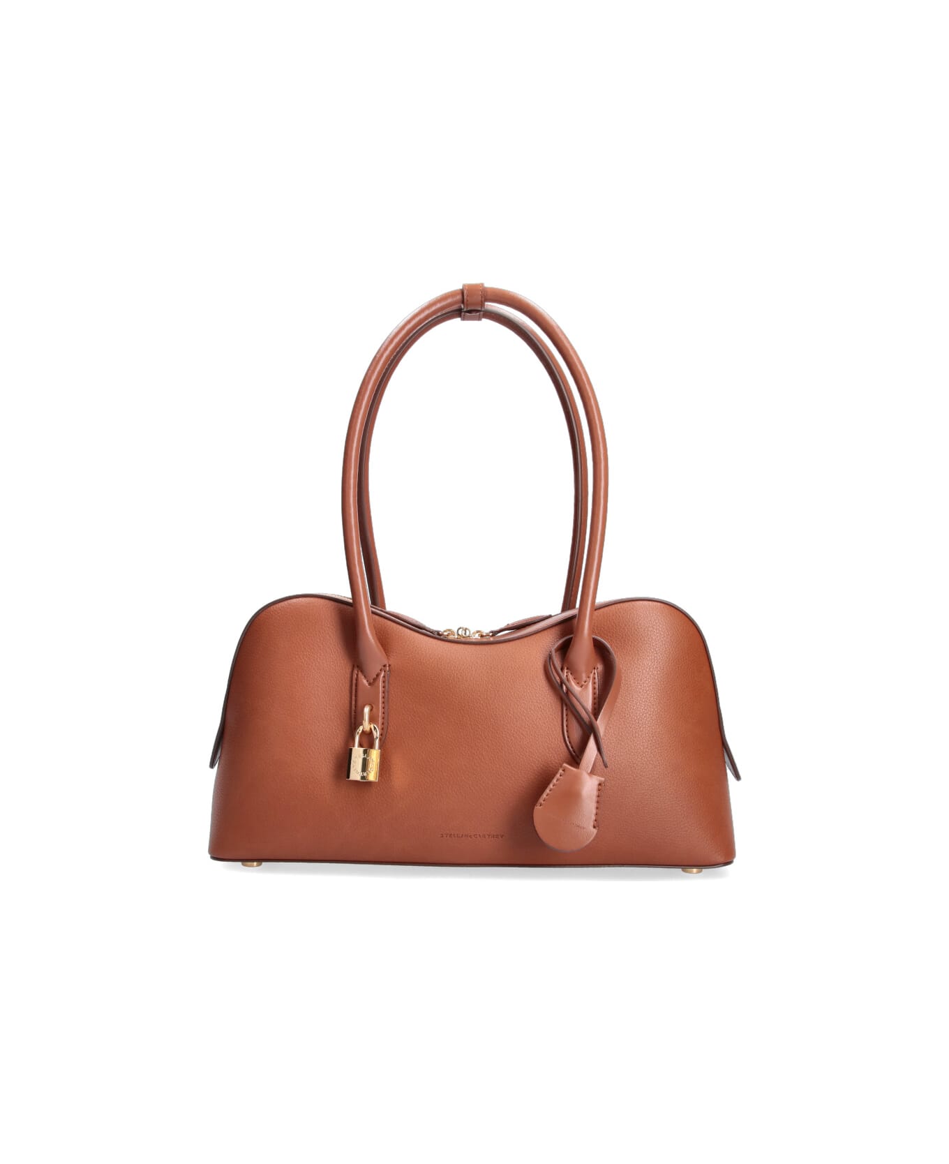Stella McCartney 'Stella Ryder' shoulder bag in brown vegan leather with two top handles, double zip closure, gold metal padlock on the front, inner flat pocket, single main inner compartment. Composition: 70% Hemp, 30% Lyocell