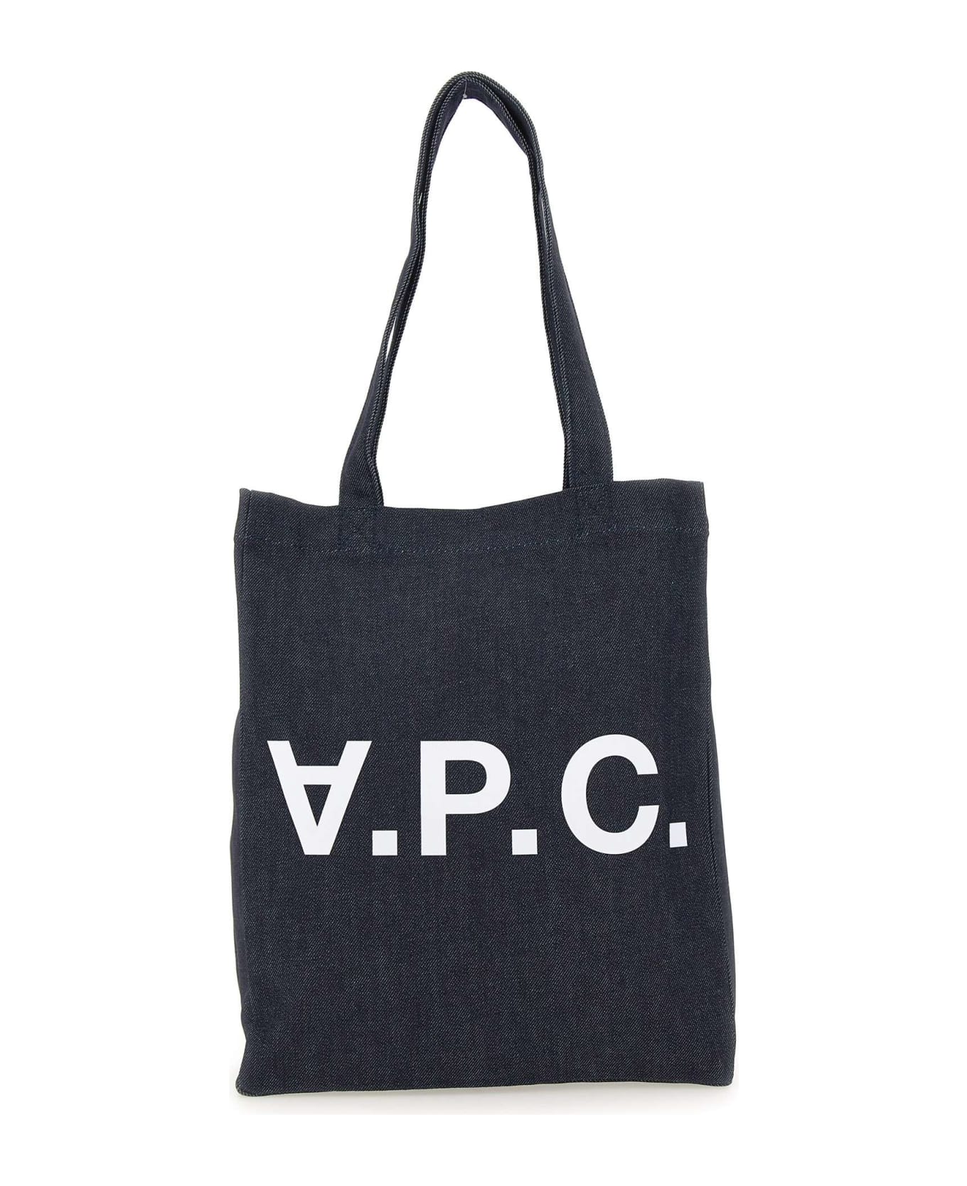 Shoulder bag A. P. C. "Tote Laure" denim fabric, dark blue, double handle upper, interior unlined with pouch pocket, maxi white logo printed in contrast on front. Dimensions: length 29cm, height 36cm, depth 7cm.