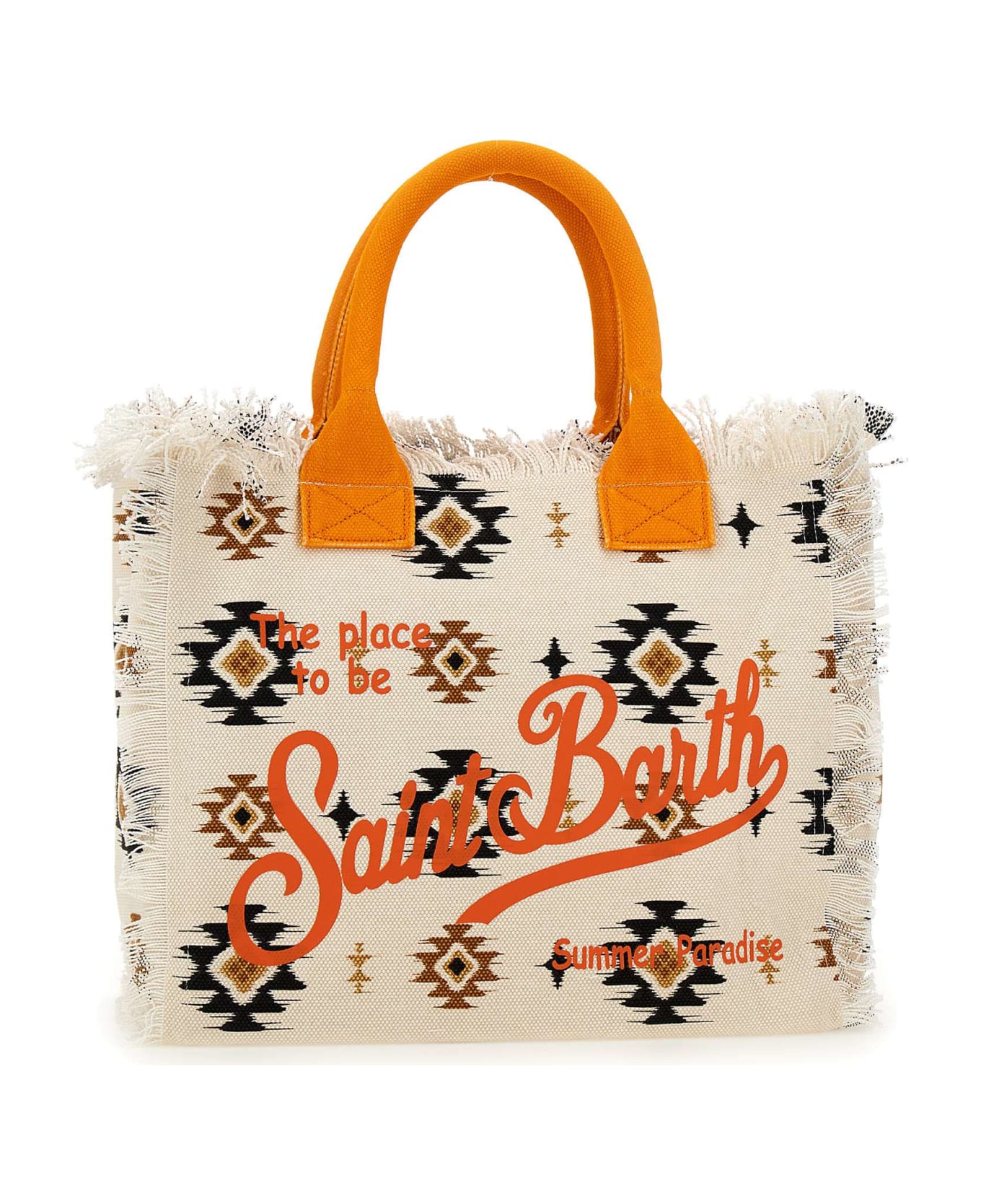 Mc2 Saint Barth "Vanity Navajo Chine" cotton canvas handbag, multicolor pattern on a cream background, double contrasting orange top handle, fringe detail, top zip fastening, single internal compartment,internal zip pocket, slip pocket with logo, cotton lining, maxi logo print on front and back. Dimensions: length 40cm, depth 20cm, height 32cm.