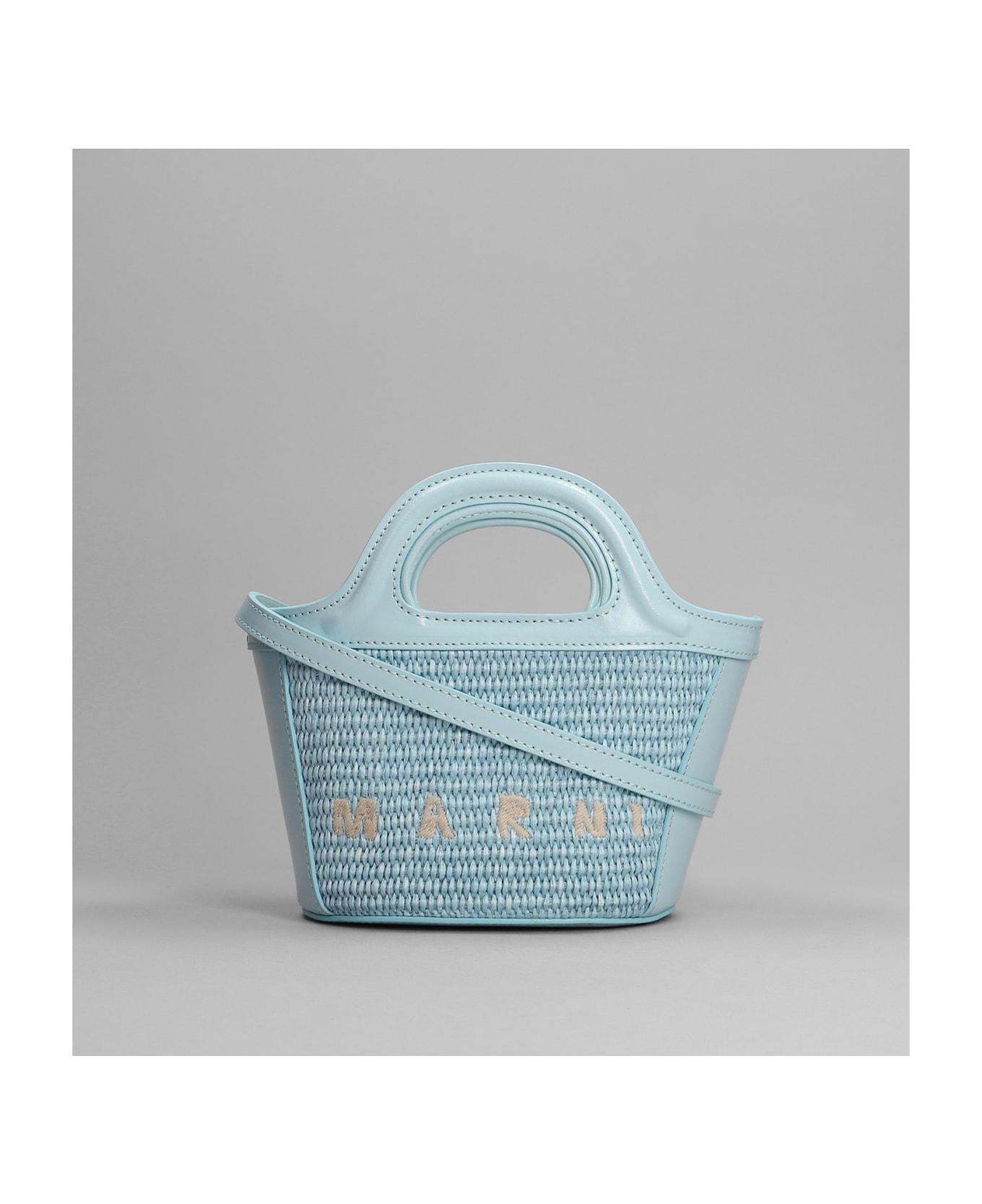 Aura mini Hand bag in cyan leather, double handle, shoulder strap, leather insert detail, front logo, Made in Italy, 100% rafia, Height 125 mm, Width 195 mm