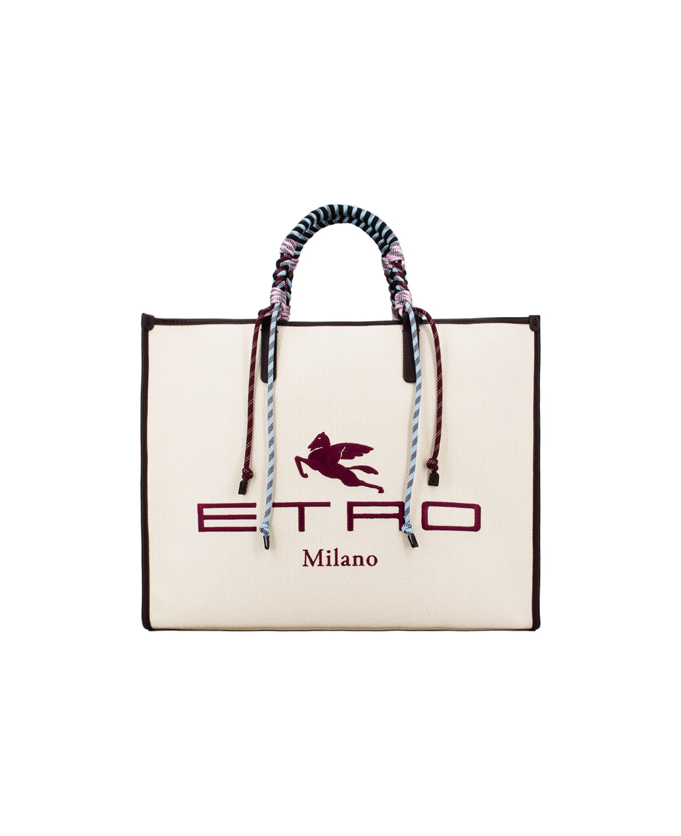 A large shopping bag made of cotton fabric with leather details, it is embellished with braided handles and contrasting embroidered ETRO logo with Pegasus, an internal zipped pocket. Dimensions: 42. 5 x 35 x 17 cm.