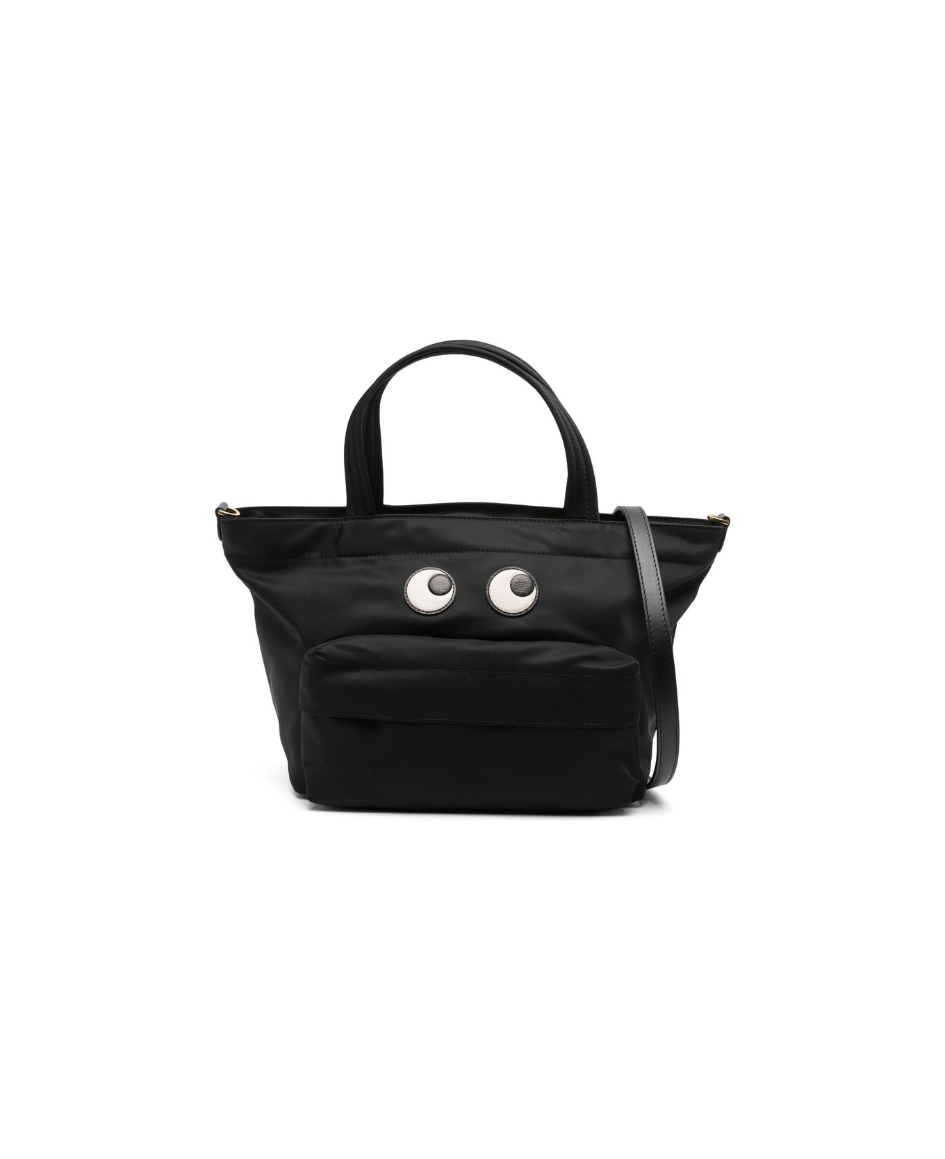black recycled nylon adjustable detachable shoulder strap two flat top handles Mini Eyes patch to the front front zip-fastening pocket logo patch to the rear main compartment internal slip pocket internal logo patch gold-tone hardware top zip fastening