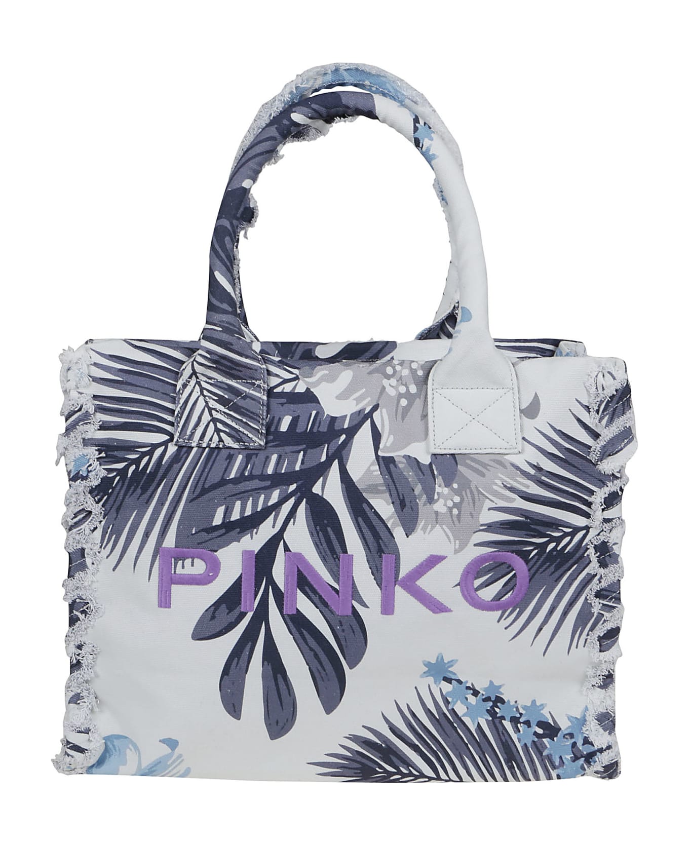 Beach BY PINKO shopper bag. Square shape in recycled cotton canvas; lined in lightweight recycled cotton fabric; double handle top handle. Embroidered logo detail and side threads with a fringed effect.