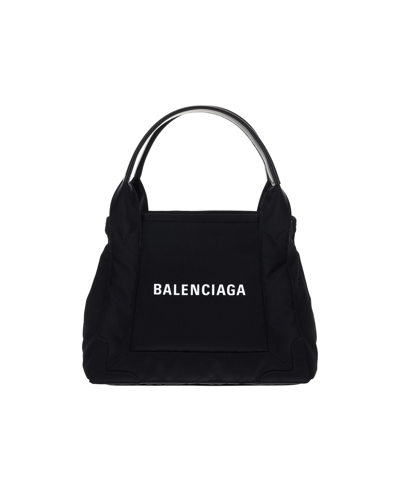 Cabas hand bag by balenciaga, two rigid leather handles, iconic brand monogram in contrast on front, snap buttons on sides, interior pouch with zipper closure. Composition: 65% % Polyamide, 65% % Polyamide