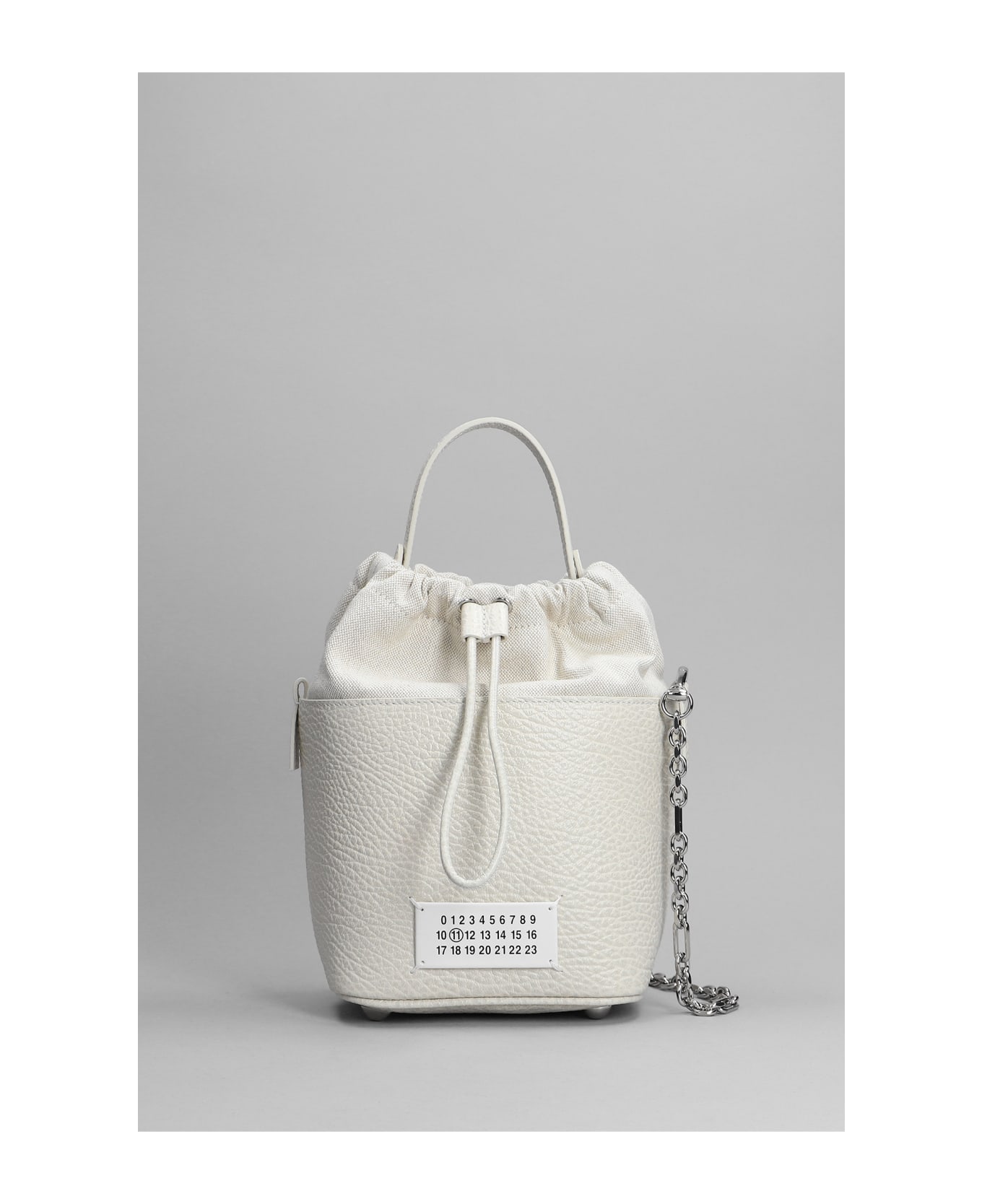 Hand bag in white leather, Height 140 mm, Width 120 mm, chain shoulder strap, handle, logo plate, coulisse closure, mesh details, 100% leather, Made in Italy