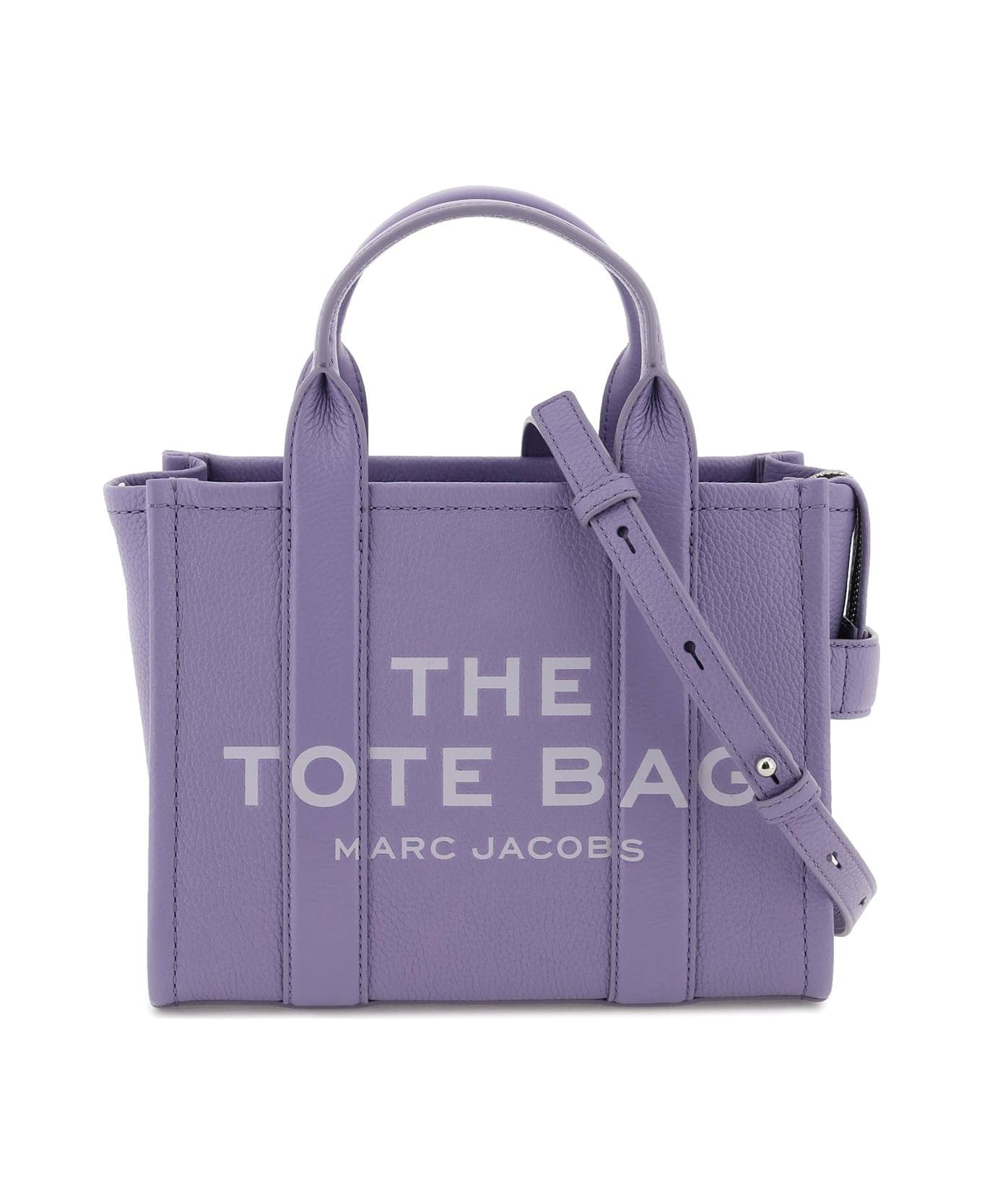 Mini Traveler Tote bag by Marc Jacobs in grained leather, featuring double top handle, adjustable and removable shoulder strap, front debossed logo, back leather logo patch, zip closure and side handle. Leather interior with a fabric open flat pocket. Silver-finished metalware.