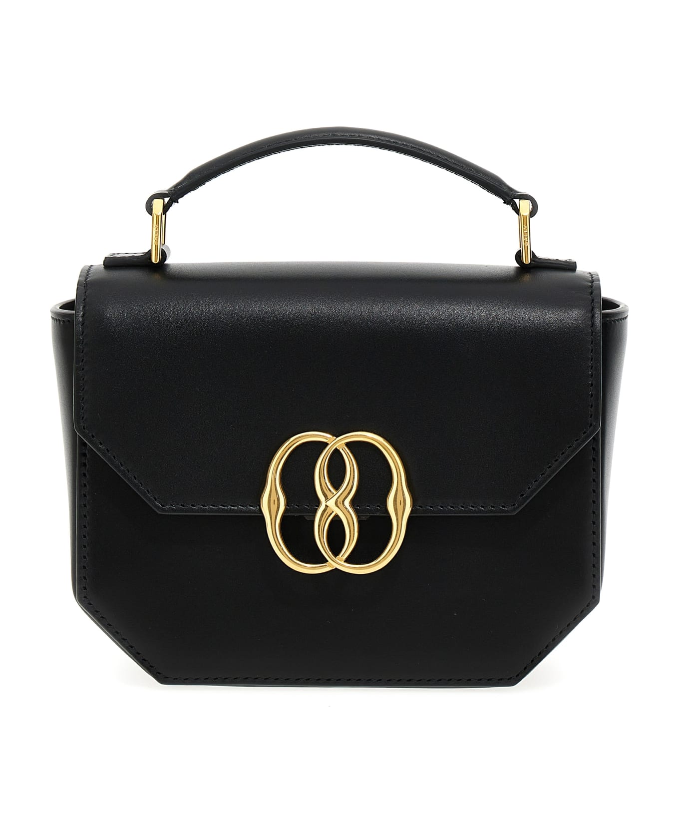 Leather handbag with magnetic flap closure with gold metal logo plaque appliqué on the front, top handle and a removable shoulder strap.