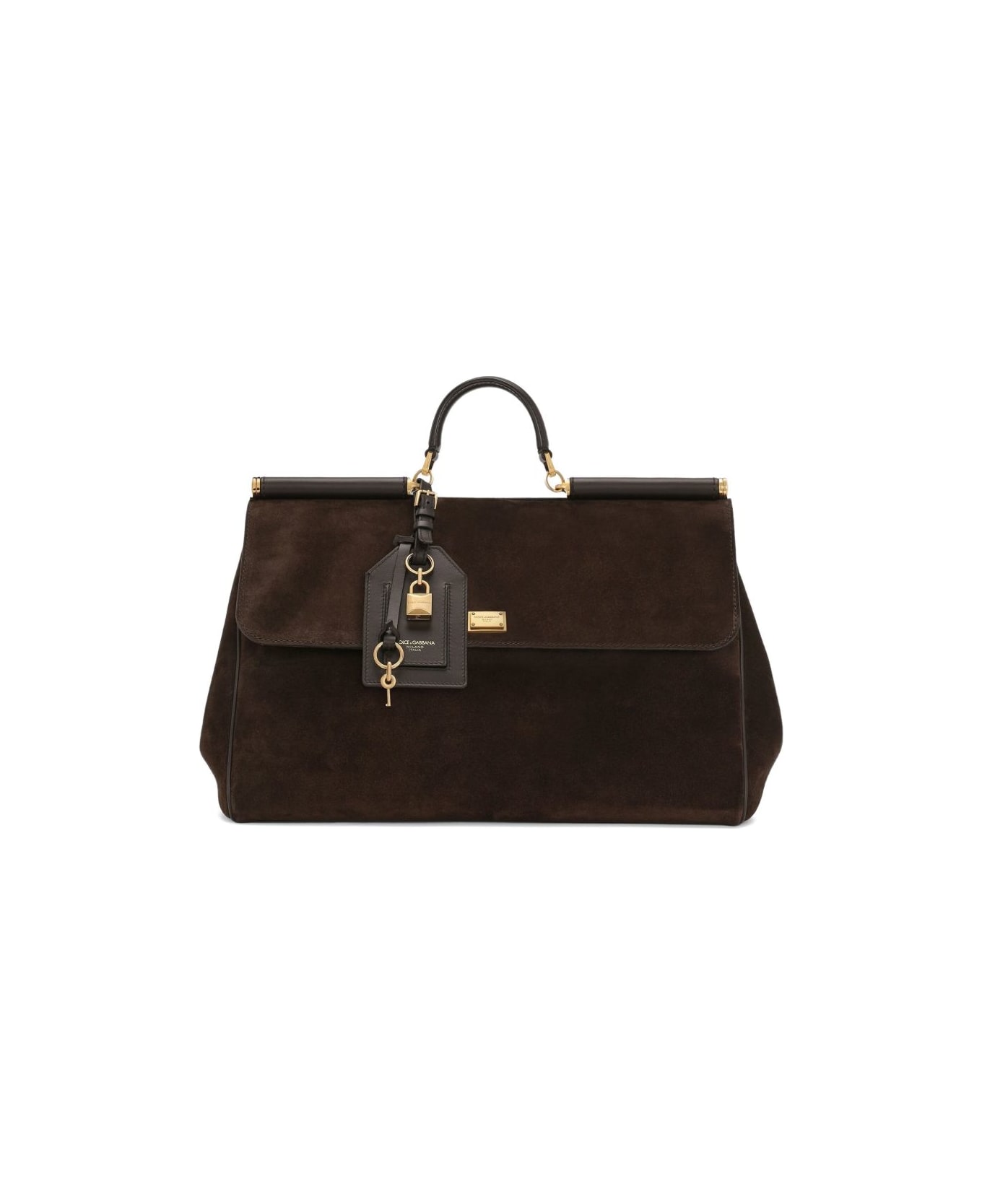 dark brown gold-tone hardware detachable shoulder strap key charm detail front flap closure logo plaque Composition: Calf Suede, 100%