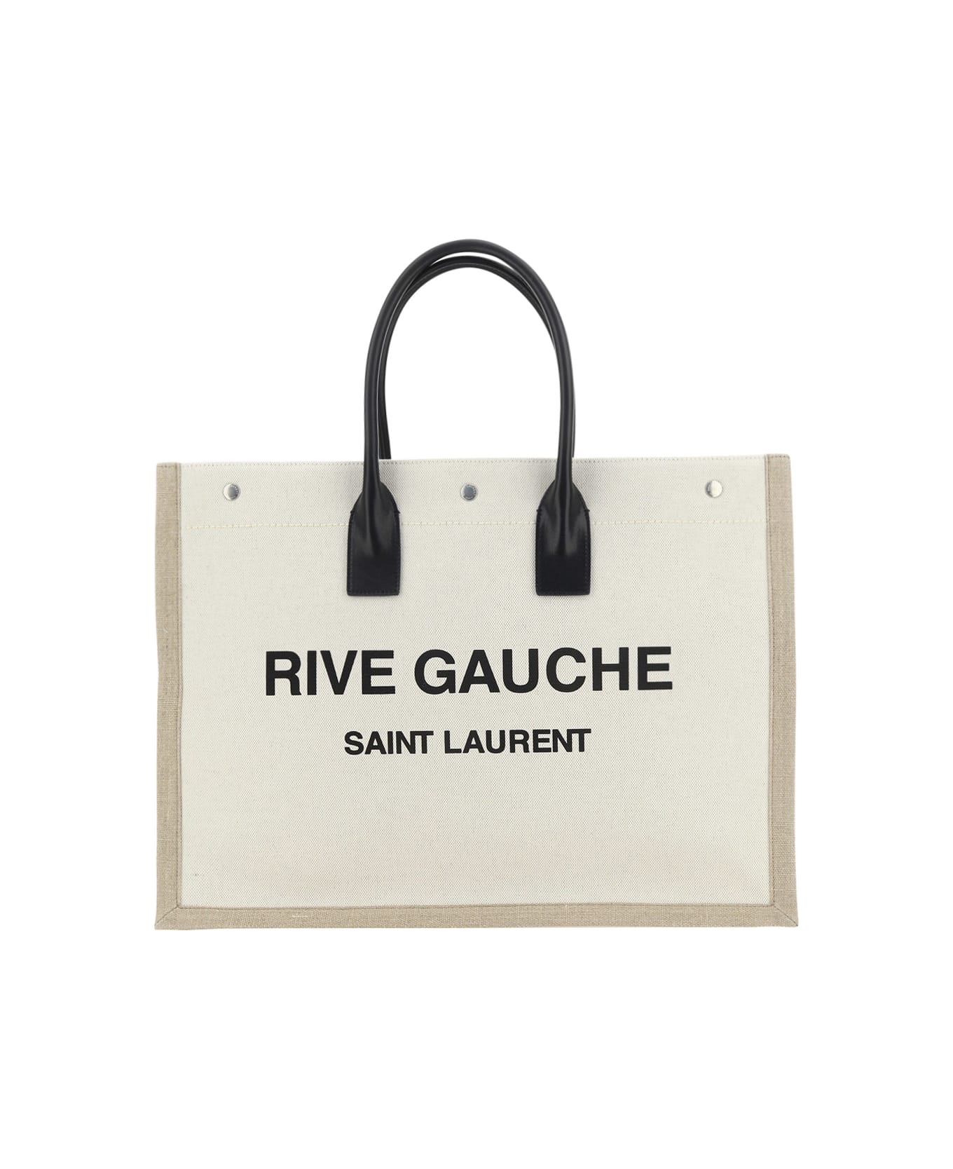 Cotton and linen rive gauche tote bag by saint laurent, double rigid leather top handle, interior snap button closure, iconic brand monogram printed in contrast on front, single interior compartment, interior welt pocket. Composition: 50% % Cotton, 50% % Linen