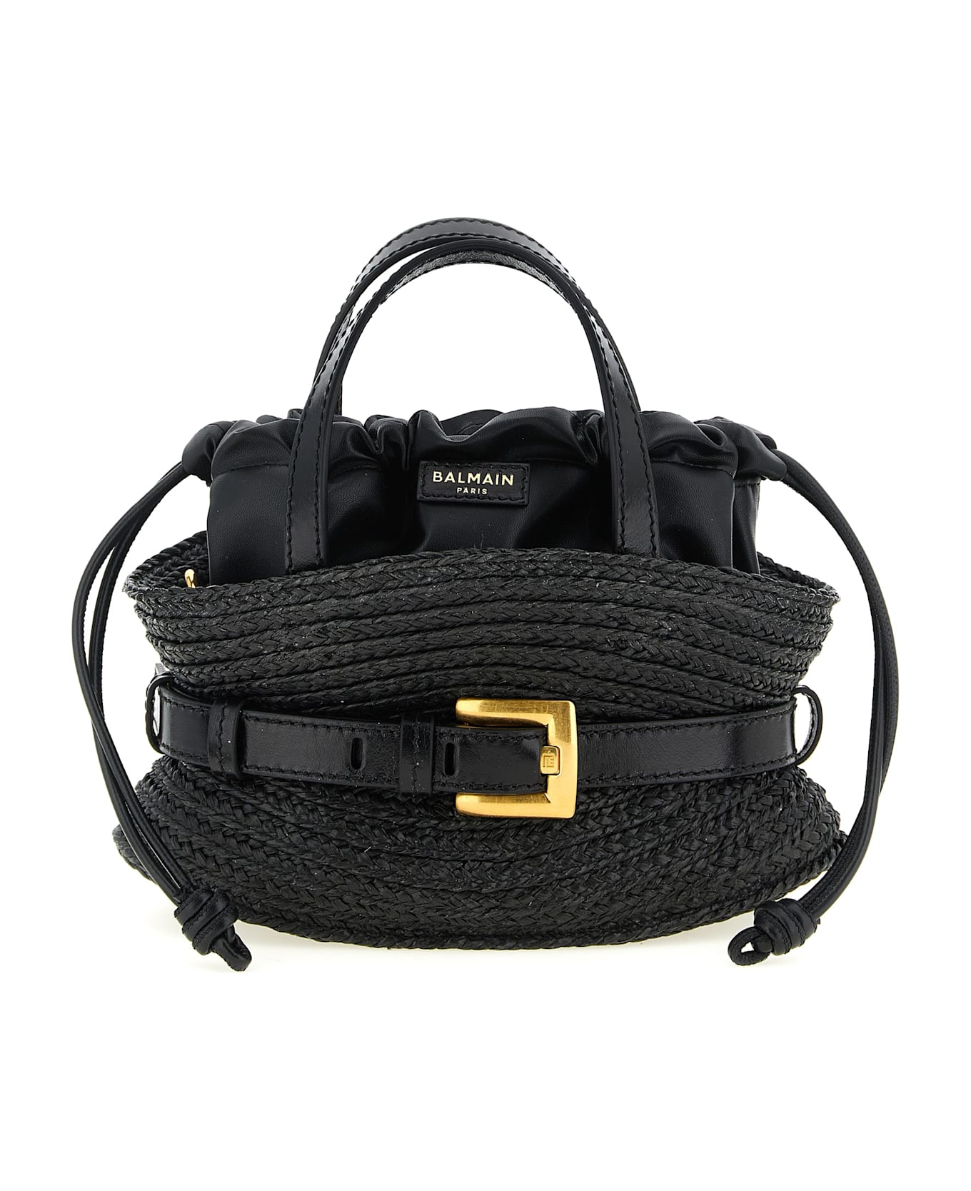 'Shuffle mini' raffia handbag with leather details, double leather handle, drawstring bag closure, adjustable and removable leather shoulder strap, front logo, front strap with buckle. Composition: 100% polypropylene