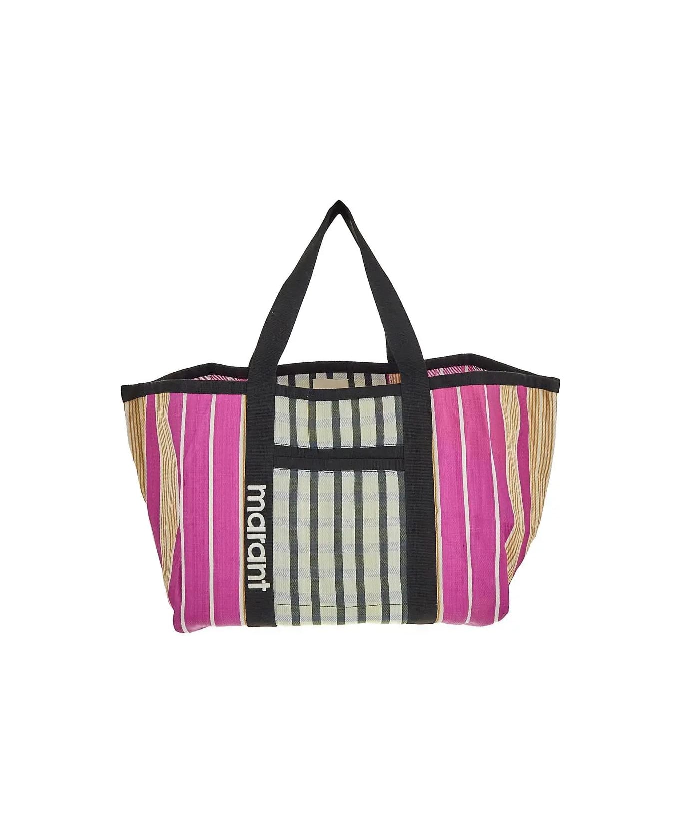 Isabel Marant Warden tote bag in multicolor nylon with stripes motif, embroidered white logo on one side, contrasting twin top handle straps that extend to the bottom, two external pockets, a main compartment and a zip pocket. Composition: 100% Nylon