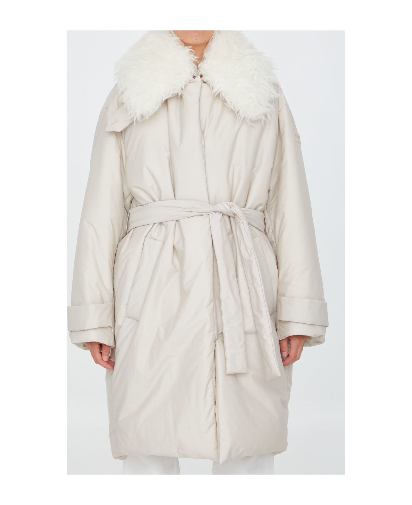 Padded down jacket in light beige cotton blend with white faux-fur collar. It features concealed front fastening, detachable waist belt, two side welt pockets and belted cuffs. Stella McCartney logo patch on left sleeve.