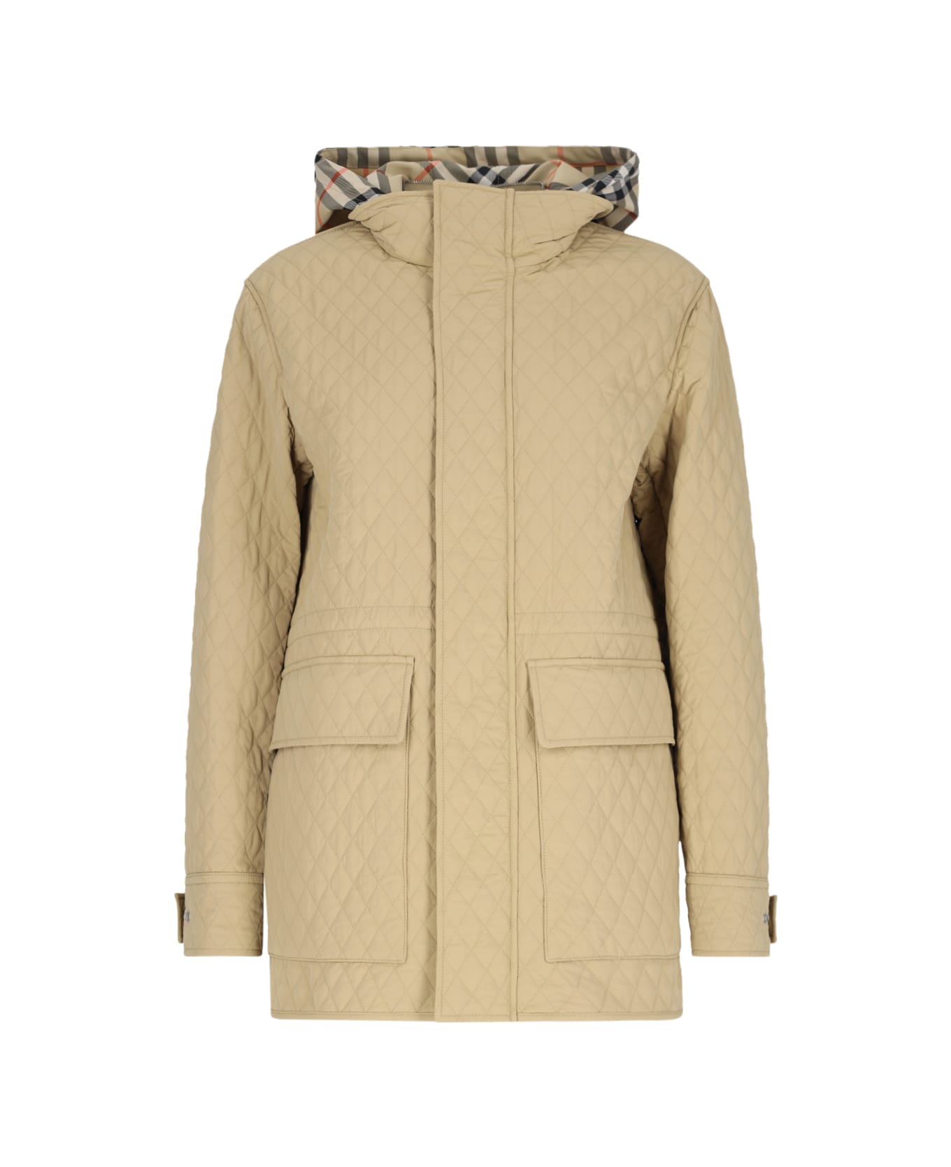 Burberry 'Check' technical hooded jacket in beige nylon with all-over geometric quilted diamond pattern, removable drawstring hood, iconic all-over pattern detail, button closure and hidden zip, adjustable straps on cuffs, two side button flap pockets, straight hem, elastic waistband detail at the hem.