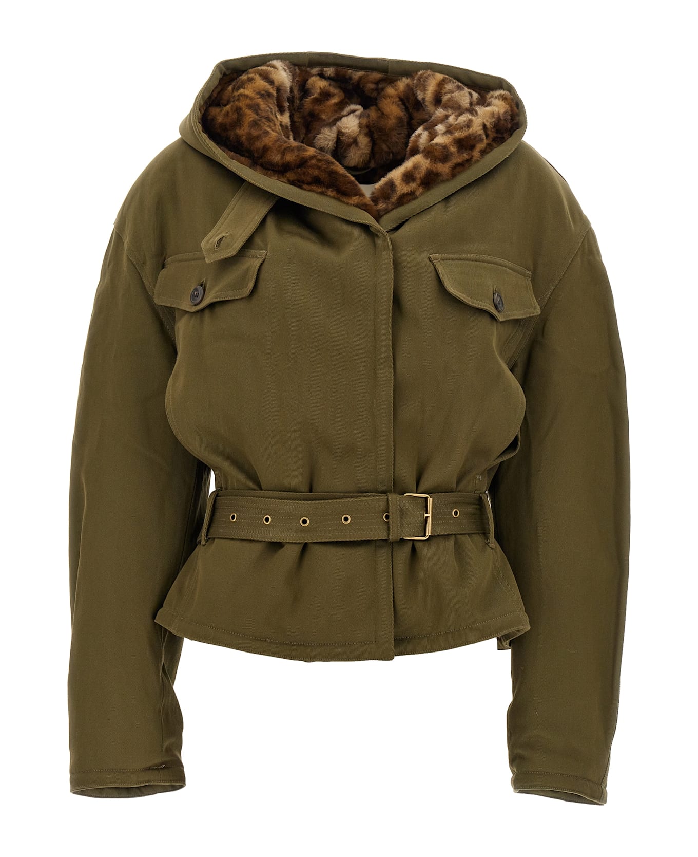 'Jerika' short coat in cotton serge, leopard-print synthetic fur lining, hood, button closure, removable belt at the waist, pockets, long sleeves. Composition: 100% cotton