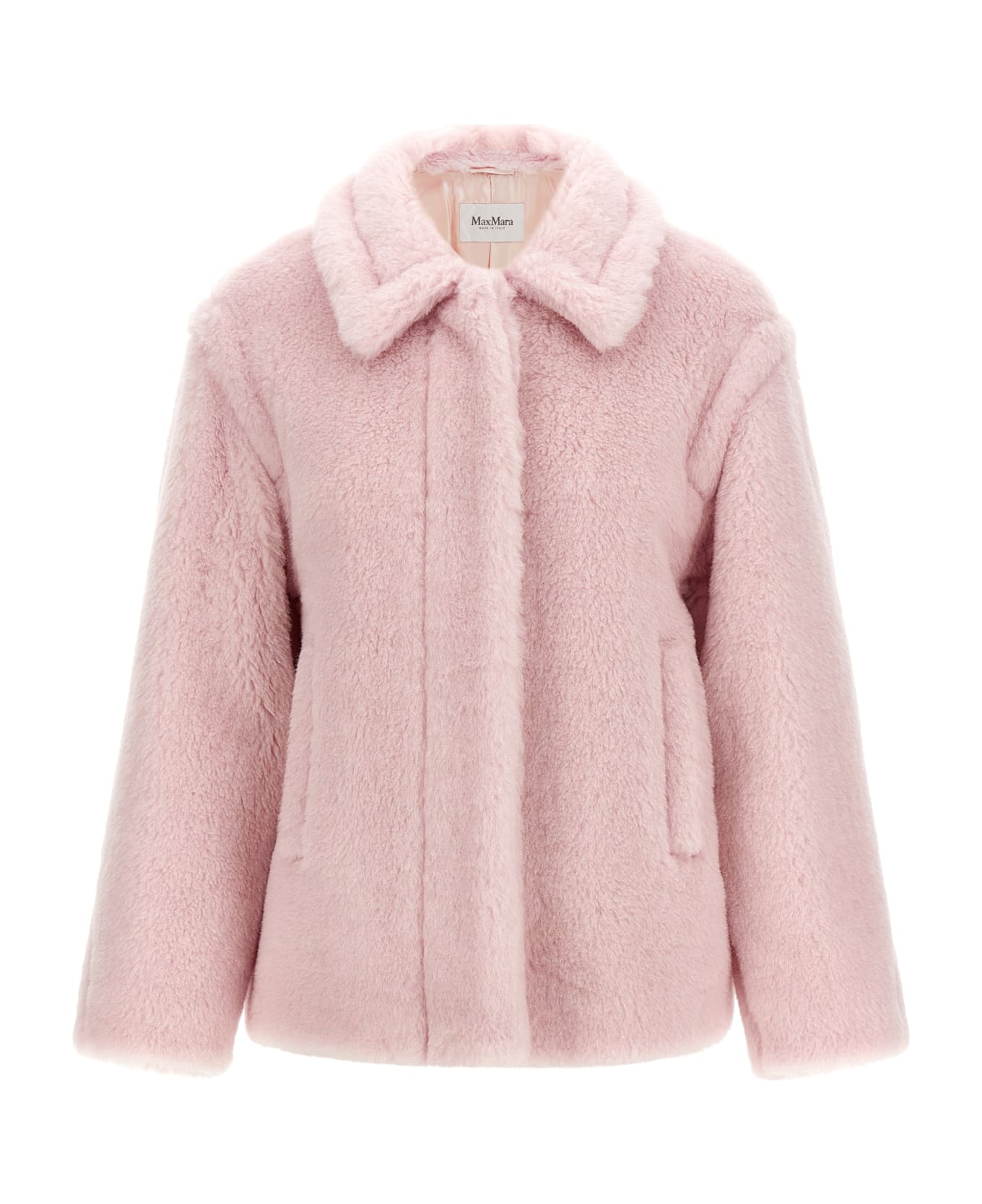 'MxmFuggito' short coat in alpaca and wool Teddy fabric on a silk base with front button closure, shirt collar, pockets, long sleeves, Monogram jacquard fabric lining. Composition: 62% wp, 26% wv, 12% se