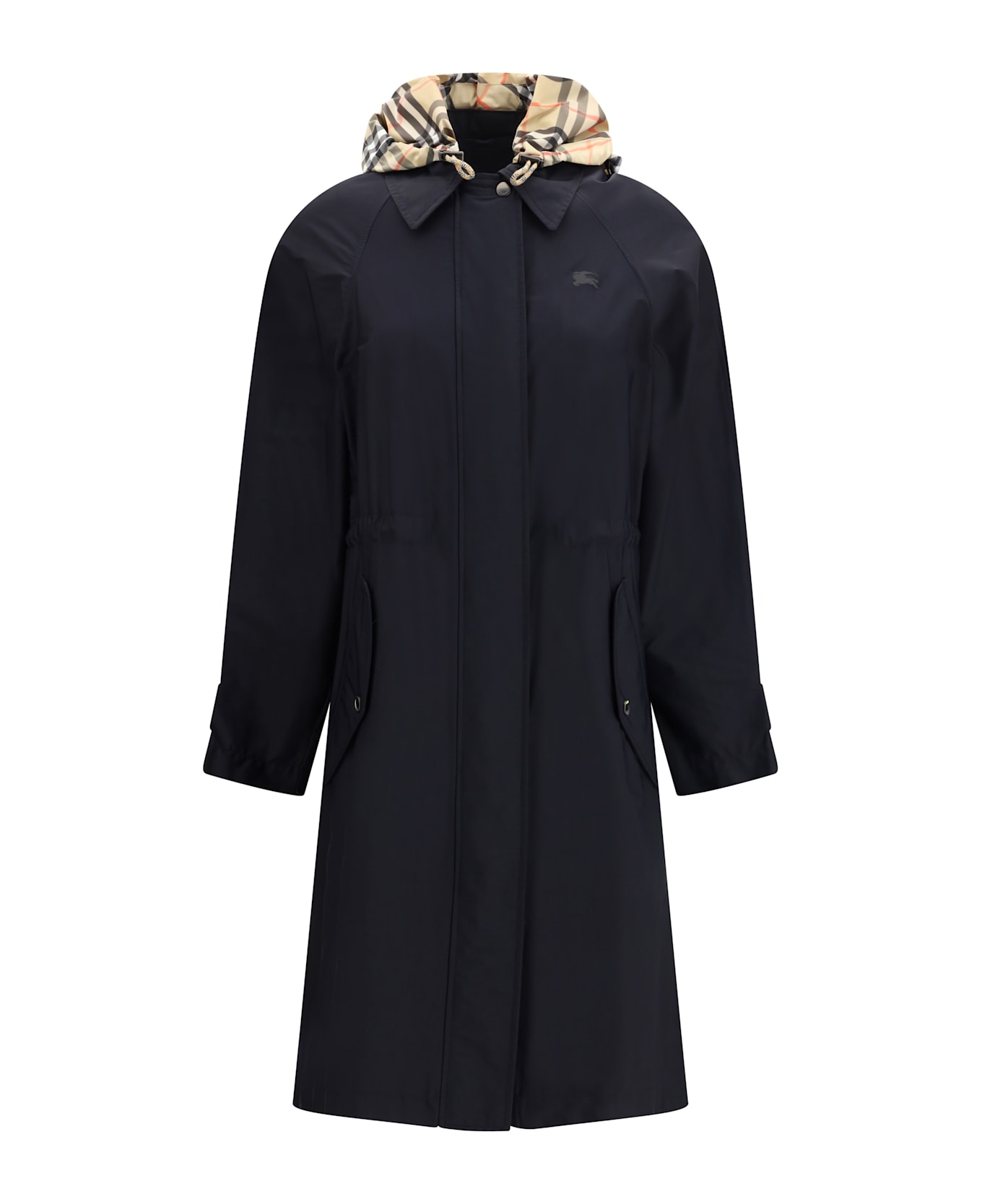 The newbury parka in stretch nylon twill by burberry delivers a contemporary functional aesthetic through refined technical construction. a concealed front closure with zip and snap buttons creates a clean silhouette, while the detachable hood with adjustable drawstring enhances versatility. long raglan sleeves with adjustable cuff tabs ensure comfort and ease of movement, complemented by an internal drawstring at the waist to shape the fit. flap side pockets with snap buttons complete the practical design, while the tone-on-tone equestrian knight design print on the chest adds a subtle and iconic signature.