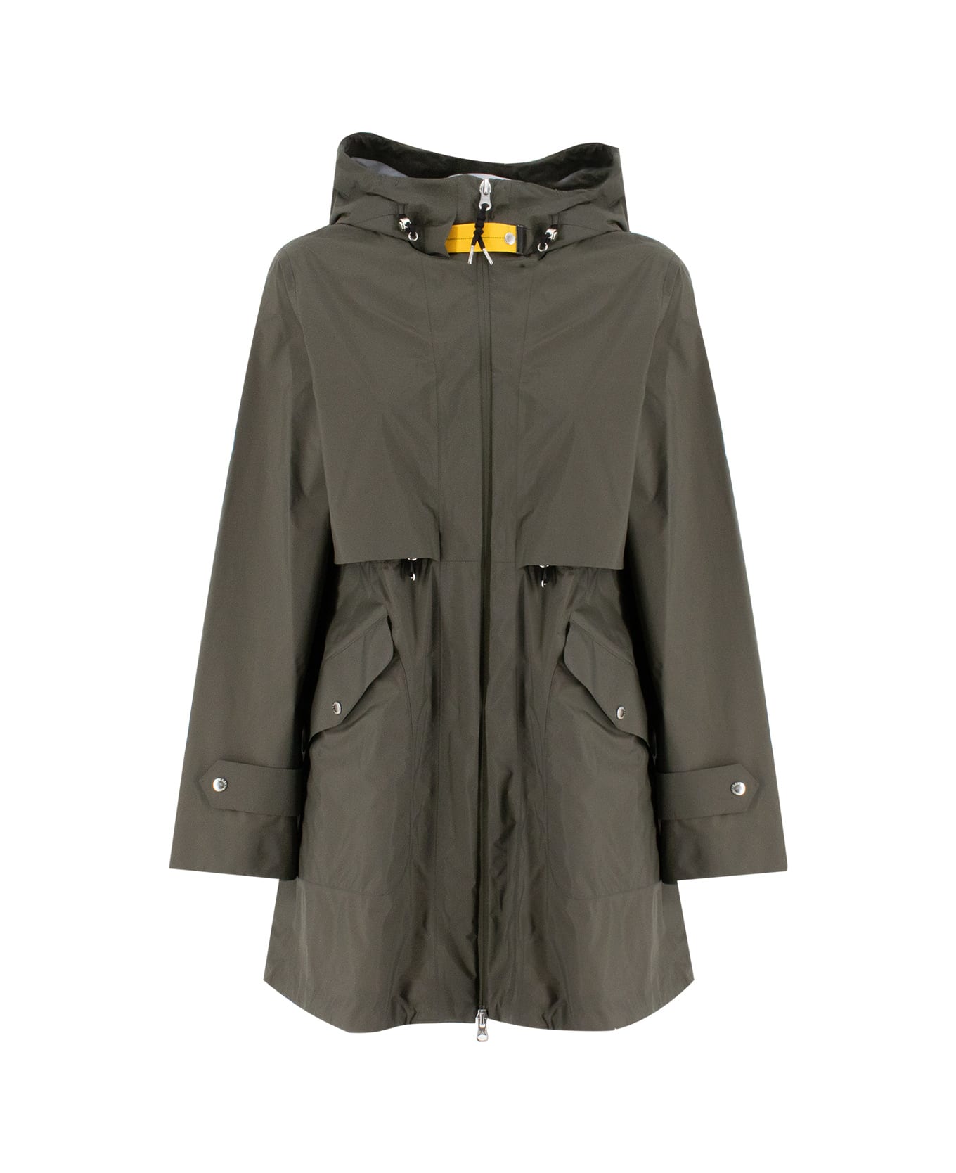 Fitted caban with drawstring waist. Drawstring hood embellished with yellow patch and side pockets. The garment has buckles on the sleeves and a regular fit.