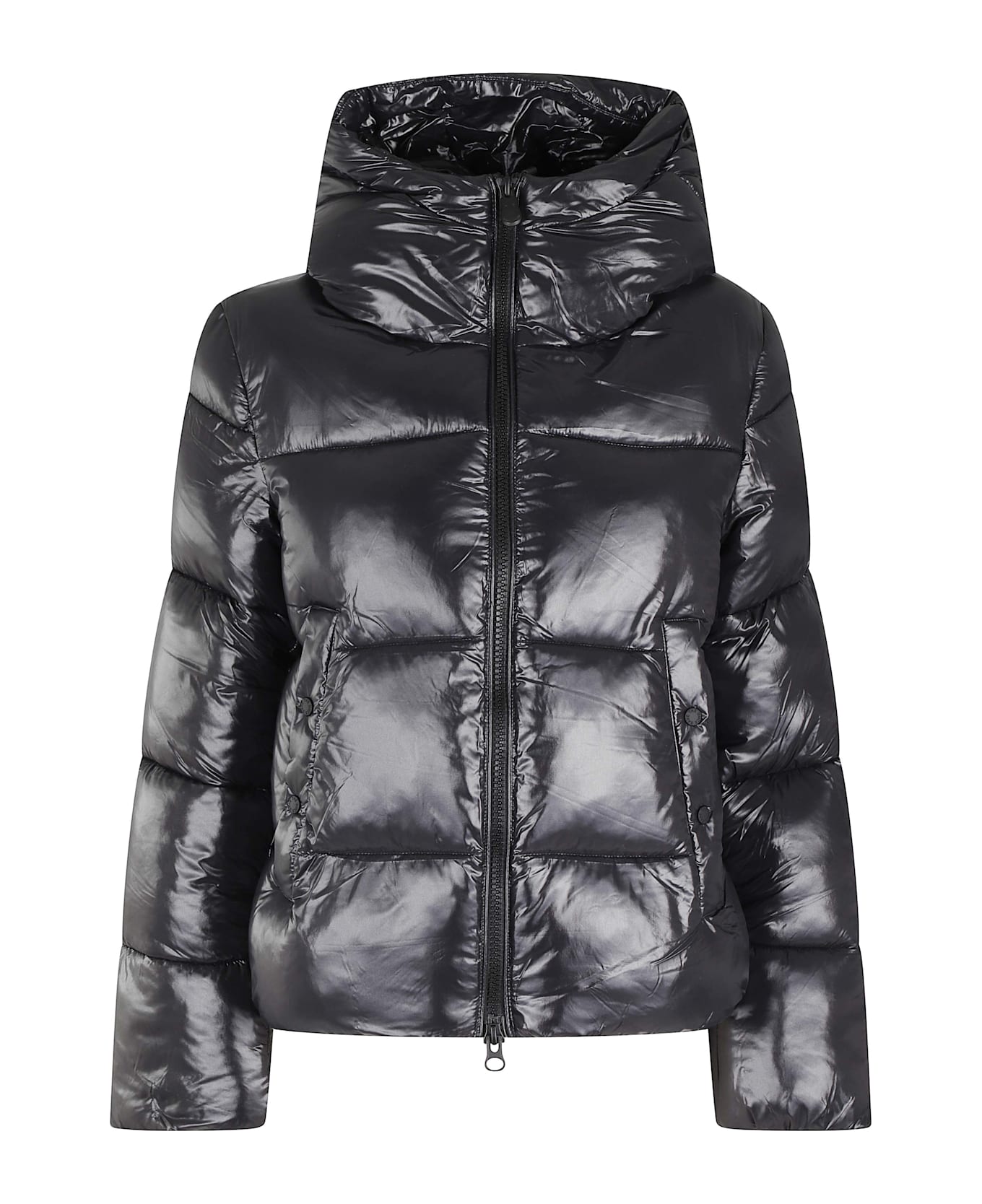 Biddy down jacket - Save The Duck - Black color - Shiny quilted nylon fabric - Hood - Long sleeve with elasticized cuff - Silicone logo applique on left sleeve - Flush side pockets with buttons - Front zipper closure