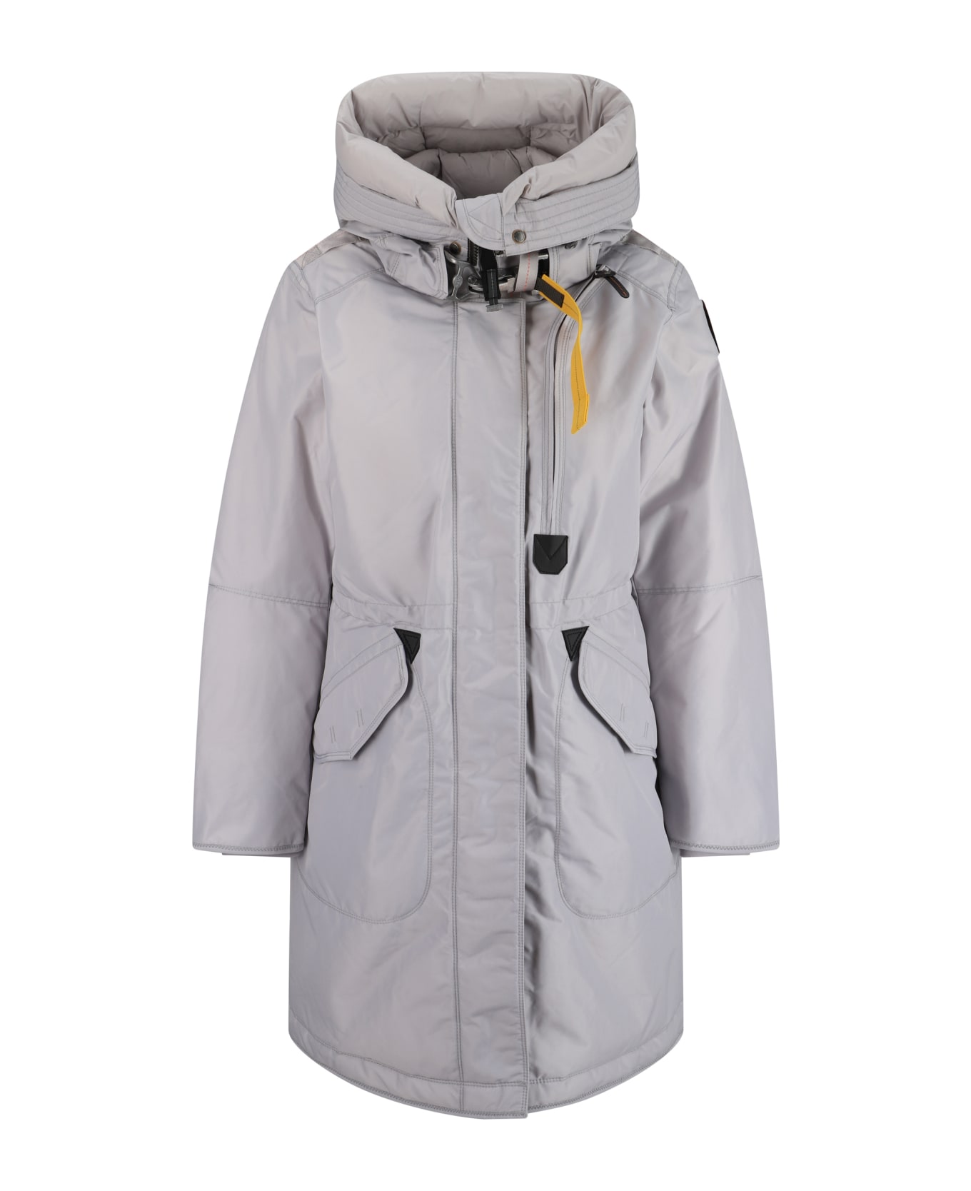 Down jacket by parajumpers, high collar with snap hook, adjustable hood with drawstring, front closure by double-slider zipper and buttons with flap, two flap patch pockets on front, large zipper pocket on front panel, ribbed cuffs, back vent, iconic brand monogram patch applied on left sleeve, all-over quilted and padded design, monochrome pattern, regular fit.