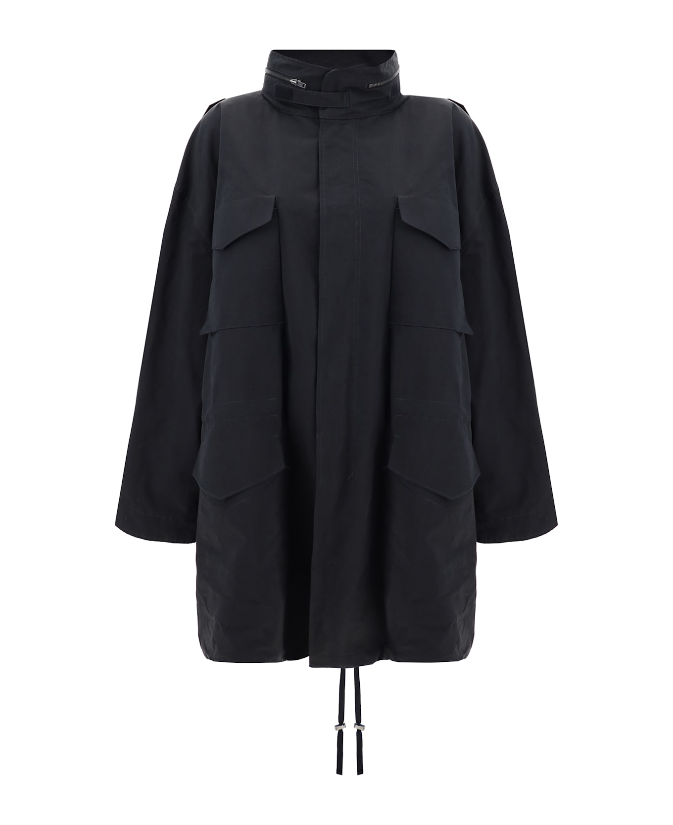 Cotton jacket by margiela, high crew neck with hood storage pocket and fitted with zipper for closure, front zipper and snap button flap closure, four flap patch pockets on front, elastic cuffs, adjustable drawstring waist, adjustable hem with concealed drawstring, all-over quilted design, monochrome pattern, oversize fit.
