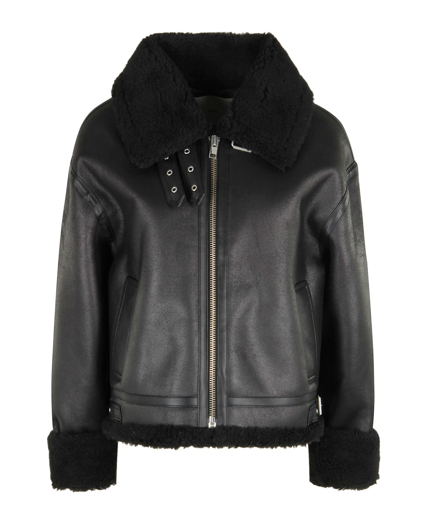 Jacket - Dunst - Black color - Faux leather fabric - Shearling collar - Long sleeve with shearling cuff - Flush side pockets - Hem with strap and buckle - Front zipper closure - Wide fit