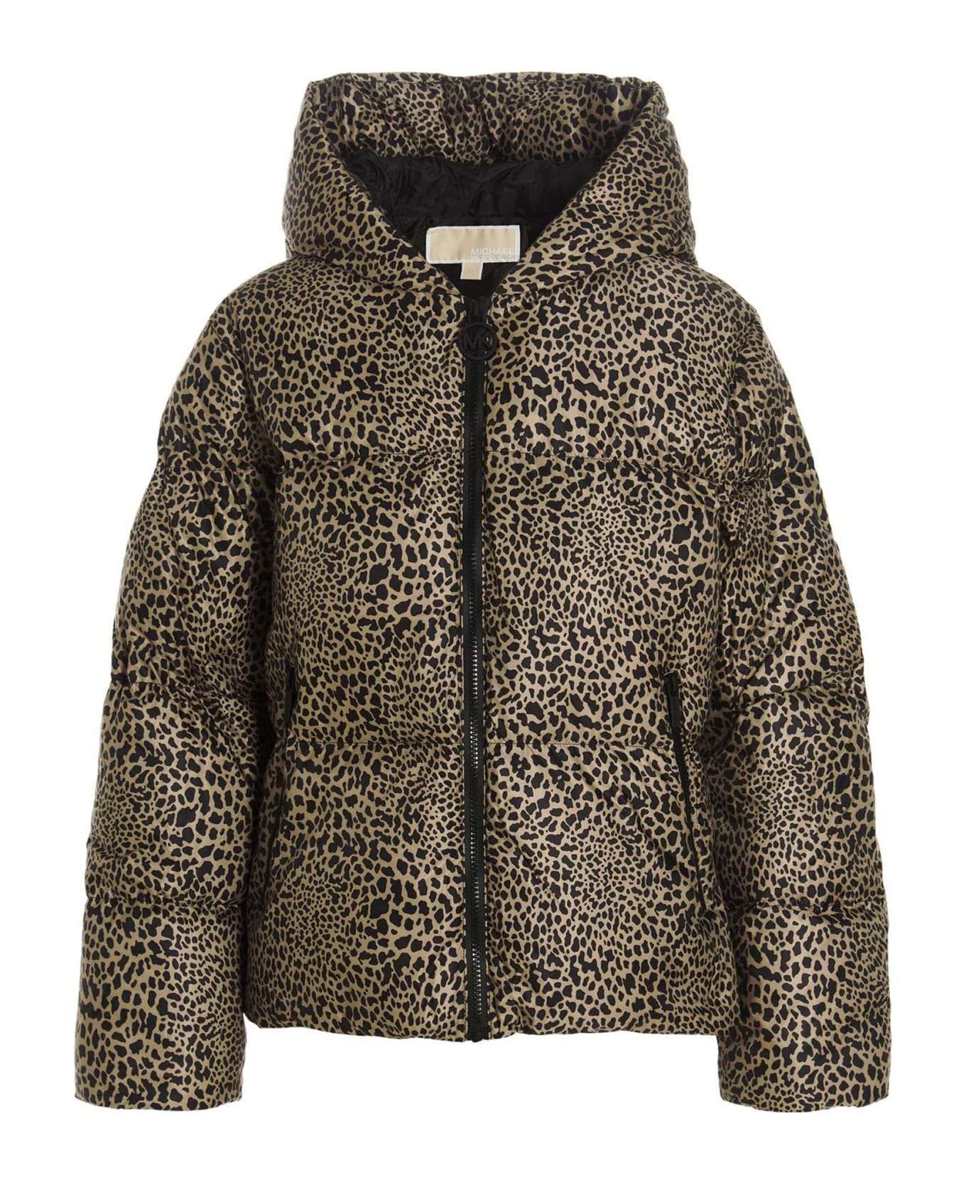 'Puffer' hooded down jacket with an all over animal print, a zip closure, pockets, long sleeves, and a side button slit detail. : Made in recycled polyester.