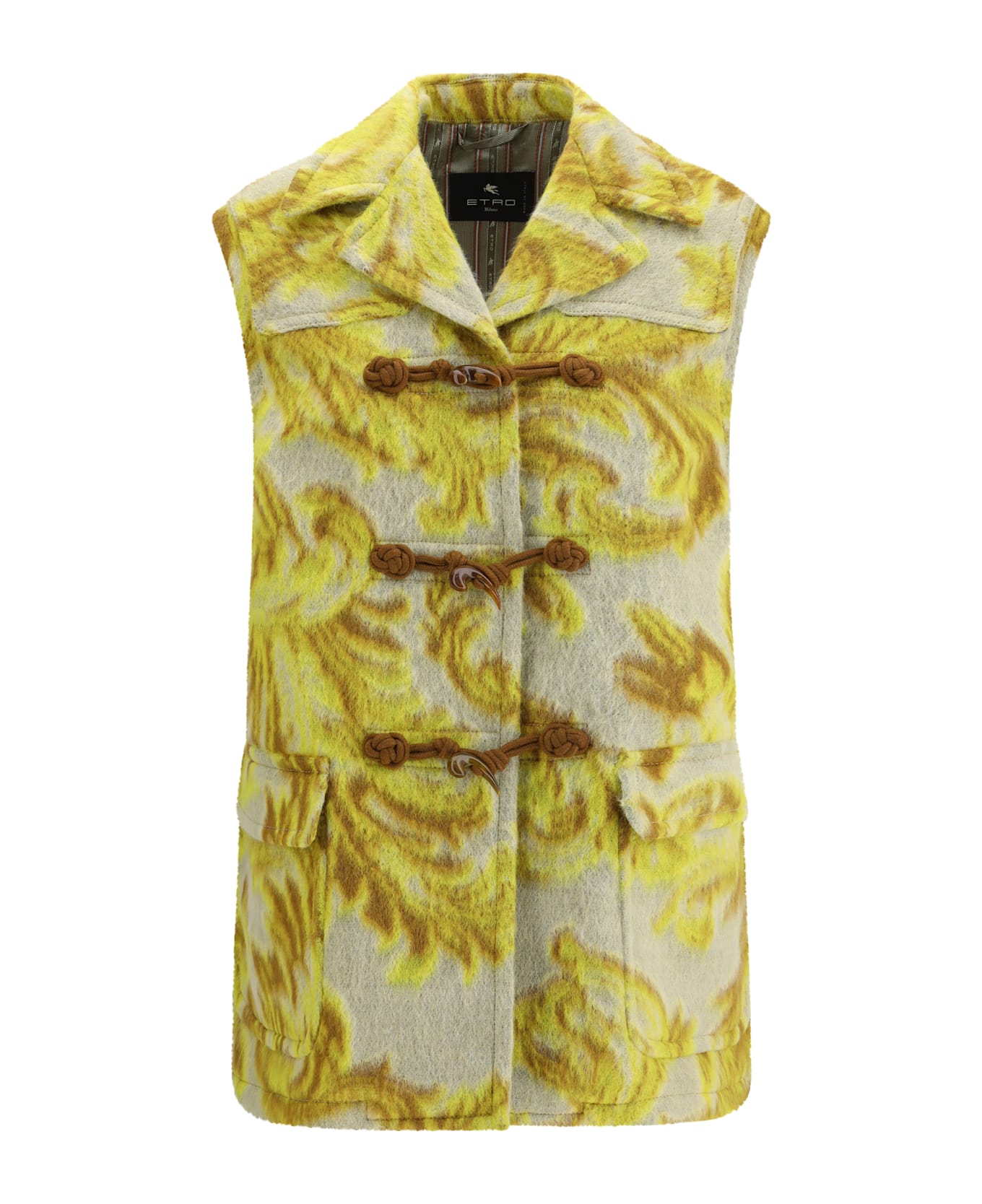 The jacquard wool-blend vest by etro reinterprets the montgomery style with artisanal elegance and distinctive character. crafted from carded wool-blend cloth, it features a unique worn-in texture and a ramage jacquard pattern that enhances its rich fabric. the fastening with toggle closures and braided cord loops, adorned with paisley-shaped buttons, adds an iconic and refined detail. front flap pockets and a back yoke complete the design, offering a regular fit and a perfect balance between tradition and modern sophistication.