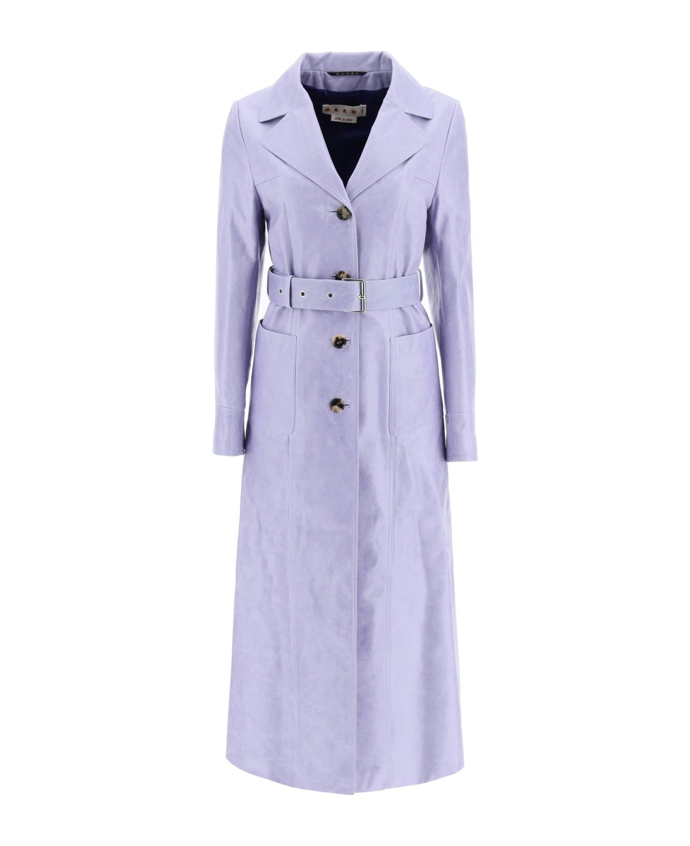 Marni long coat in shiny calf leather featuring a single-breasted buttoning with lapel collar and adjustable buckled waist belt. Finished with side patch pockets and a back vent. Full lining. The model is 177 cm tall and wears a size IT 40. Composition: 100% CALF LEATHER