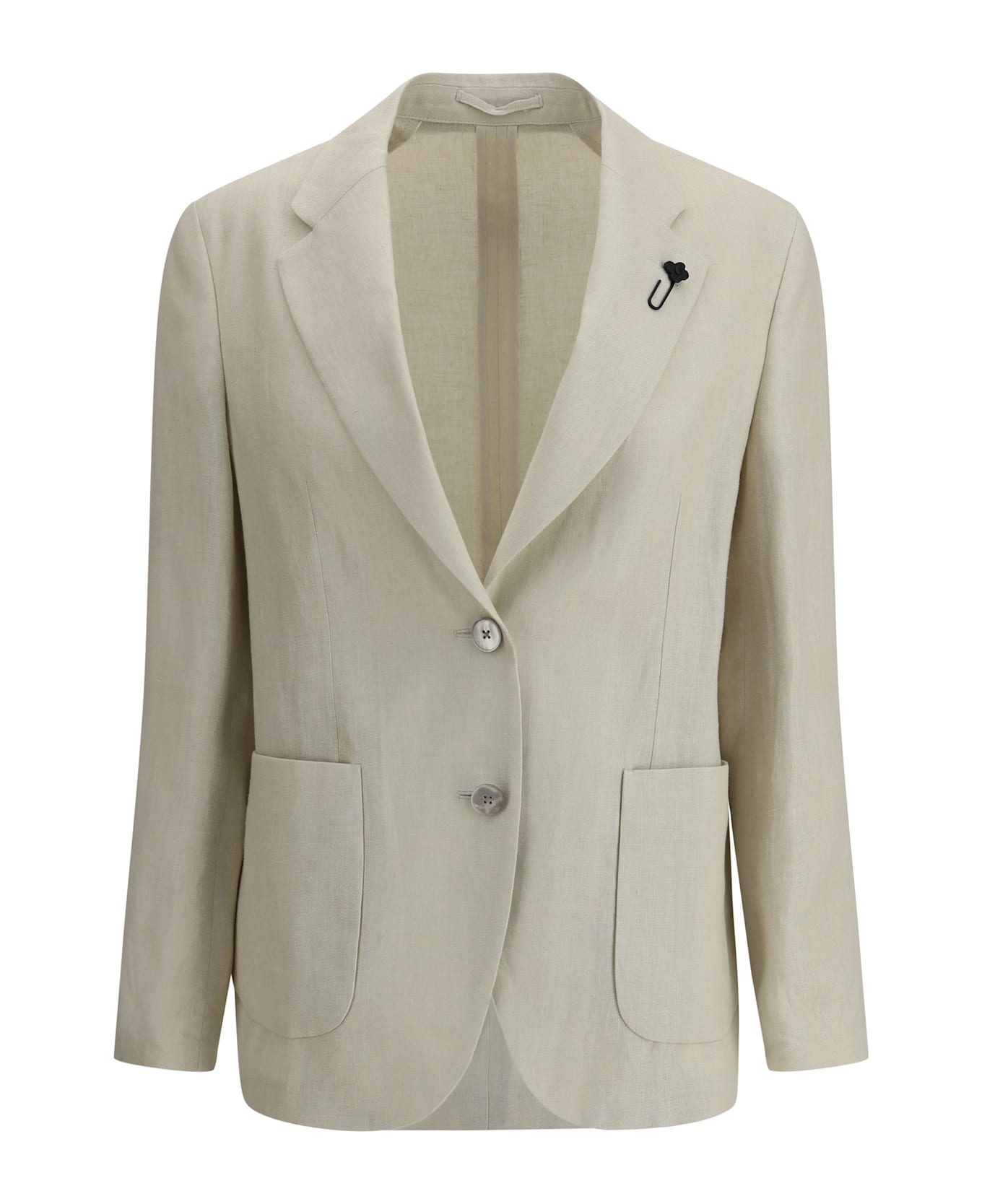 The lardini linen blazer is an elegant and sophisticated piece, perfect for the warmer seasons thanks to the lightness of linen. the classic lapels give a formal and refined look, while the single-breasted front closure with buttons adds structure and cleanliness to the design. the two patch pockets on the front offer functionality without compromising aesthetics, maintaining an elegant and sober look. the iconic flower pin applied on the lapels is a distinctive touch that enriches the blazer with an accent of originality and style. a versatile piece, ideal for elegant occasions or to add a touch of class to a casual-chic outfit.
