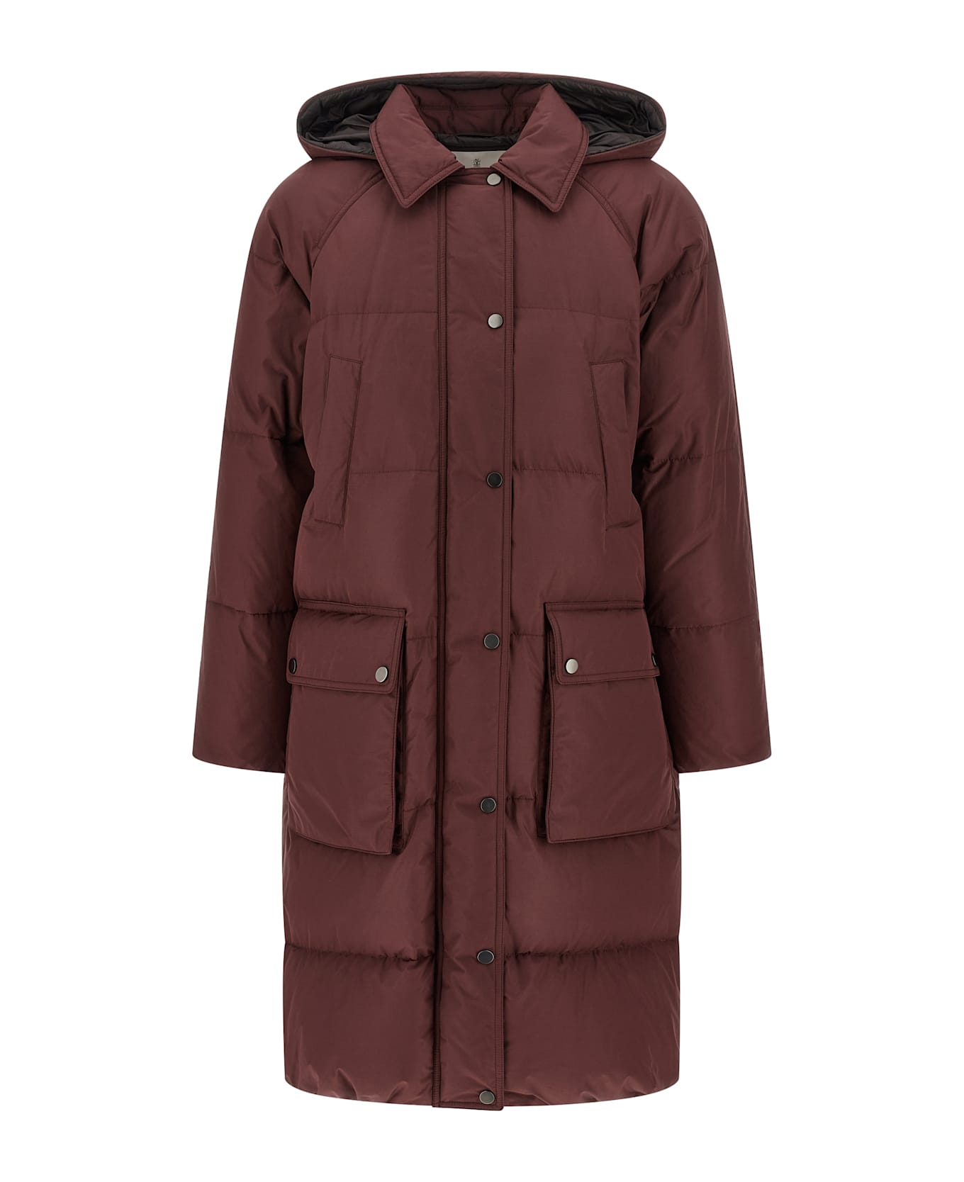 Long down jacket in quilted technical fabric padded with water-repellent goose down, removable hood, shirt collar, zip closure with 'Shiny Zipper Pull' monile zipper puller and front snap buttons, pockets, long sleeves with elastic cuffs, drawstring on the hem.