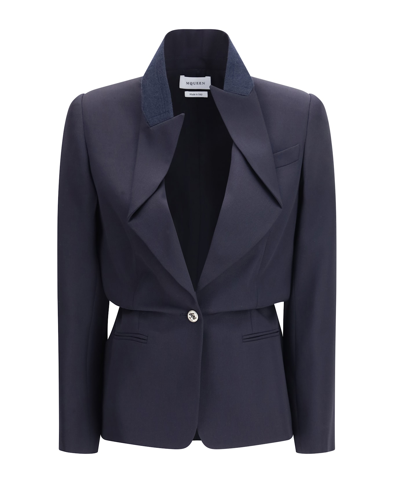 This single-breasted jacket by alexander mcqueen is crafted from refined navy grain de poudre and features distinctive peak lapels folded inward, enhancing its tailored character. it is designed with a chest pocket and two side welt pockets, while the slightly nipped-in waist accentuates the silhouette with elegance. the single-button front fastening completes the look with a clean and sophisticated finish. Composition: 100% % Wool Ovis Aries